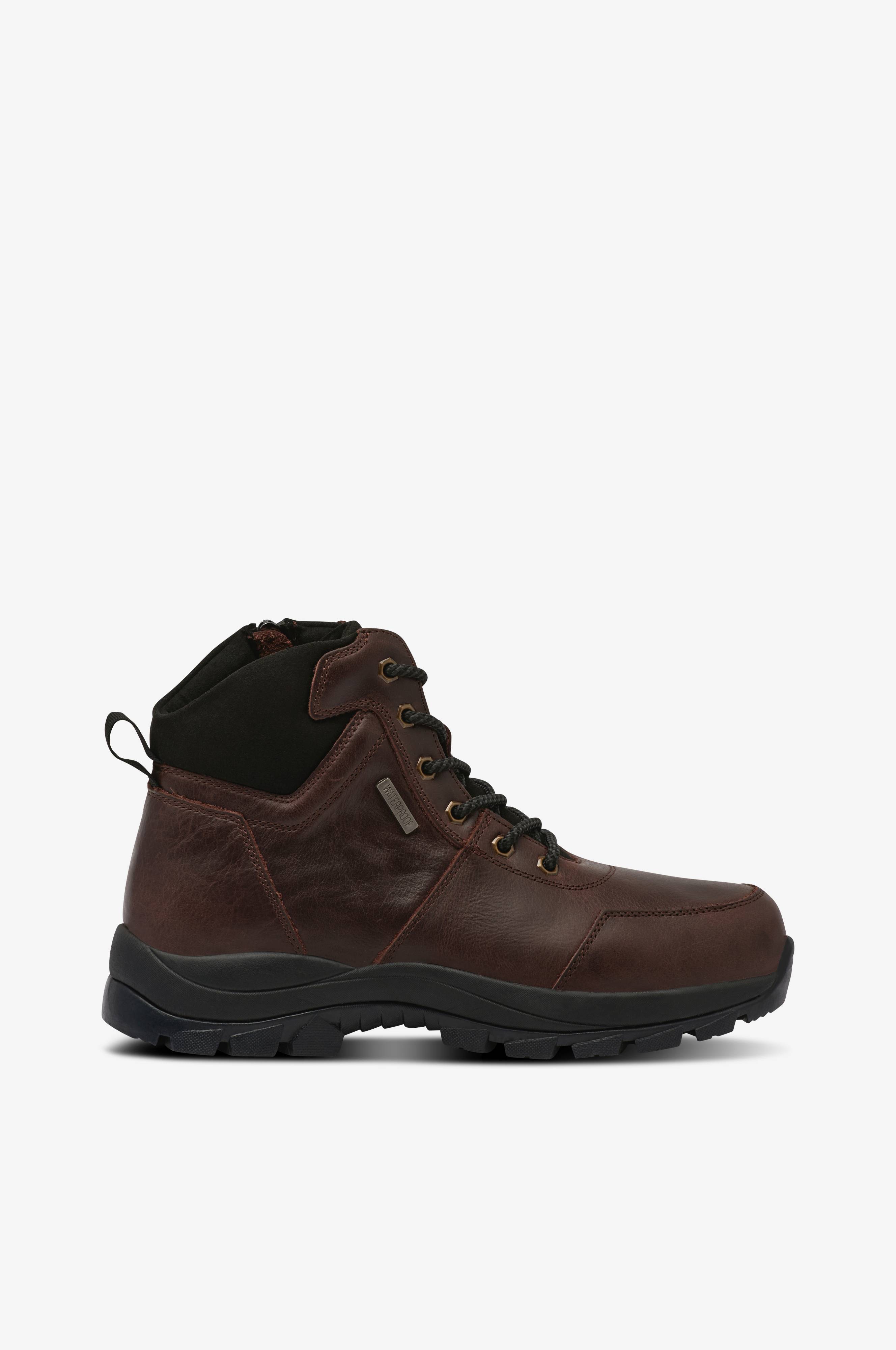 • Varmforede, vandtætte vinterstøvler med udfoldelige knopper under sålerne.• Øvredel i læder• Snøring• Lynlås på indersiden af skaftet• Vævet trækstrop bag på skaftet• Tekstilforing• Ydersål i gummi med sammenfoldelige crampons i metal