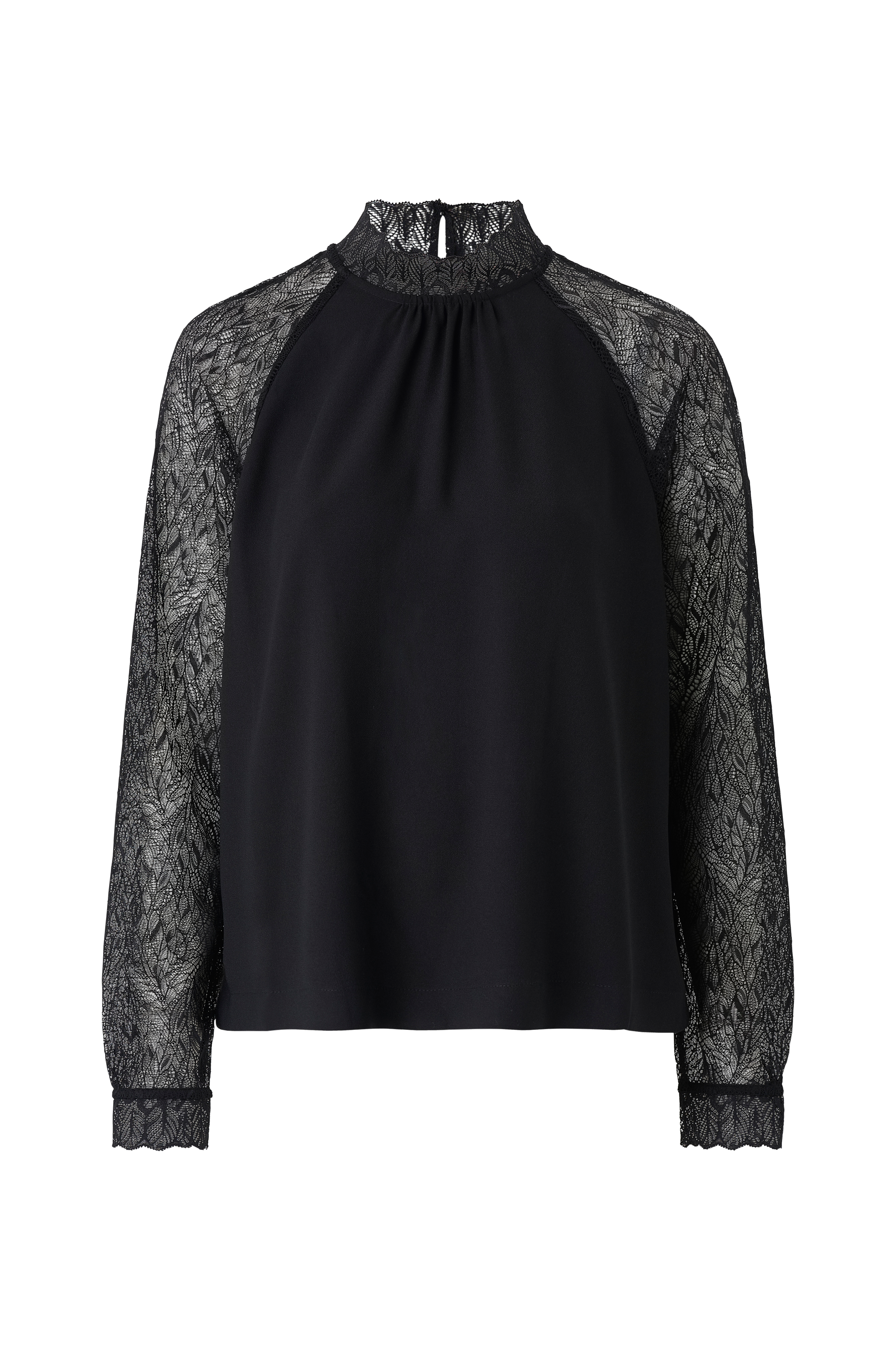 • Transparente ærmer i blonde• Lille opretstående krave i blonde• Ventilation med knap i nakken
