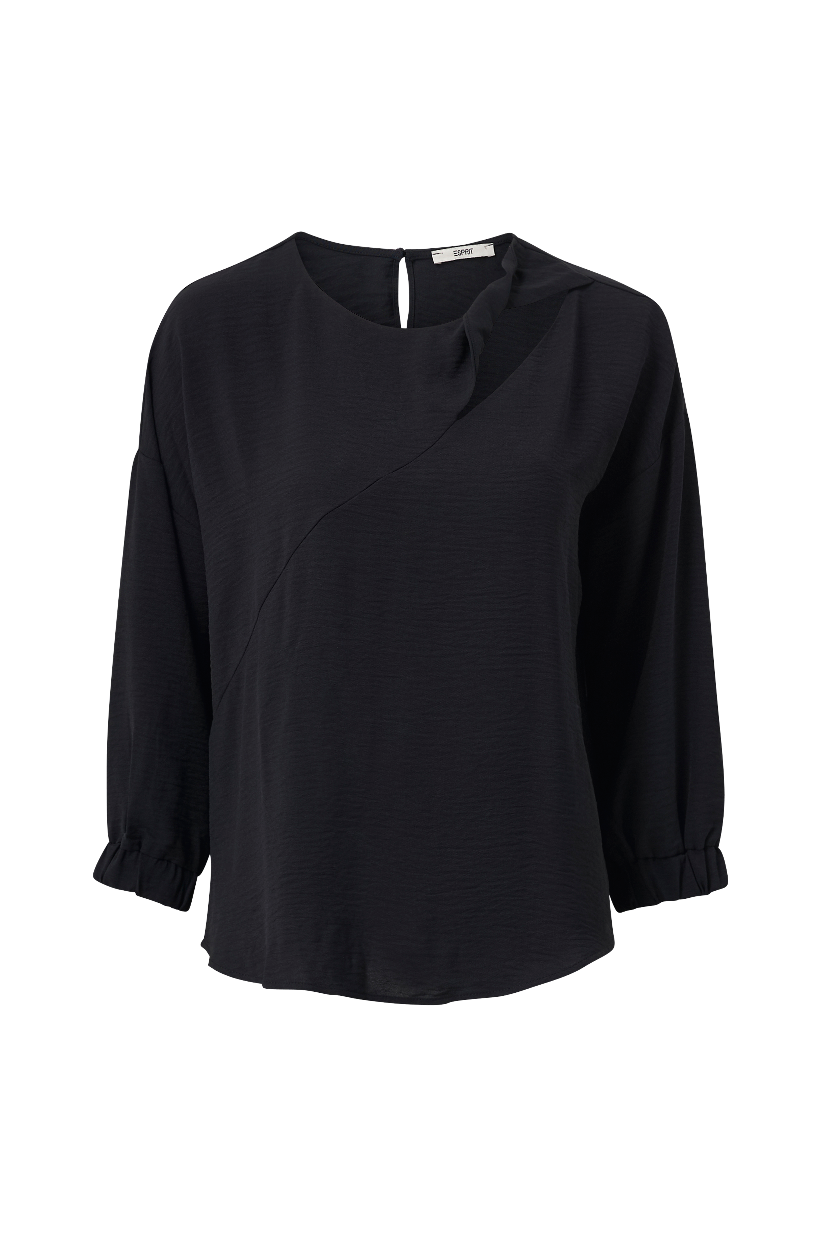 - Bølgende, vævet materiale- Rund udskæring med knap og nøglehulsudskæring bagpå- Udskæring med snoet detalje i den ene side foran- Lav skulder- Asymmetrisk bærestykke- 3/4-ærme med elastisk rib- Løst snit