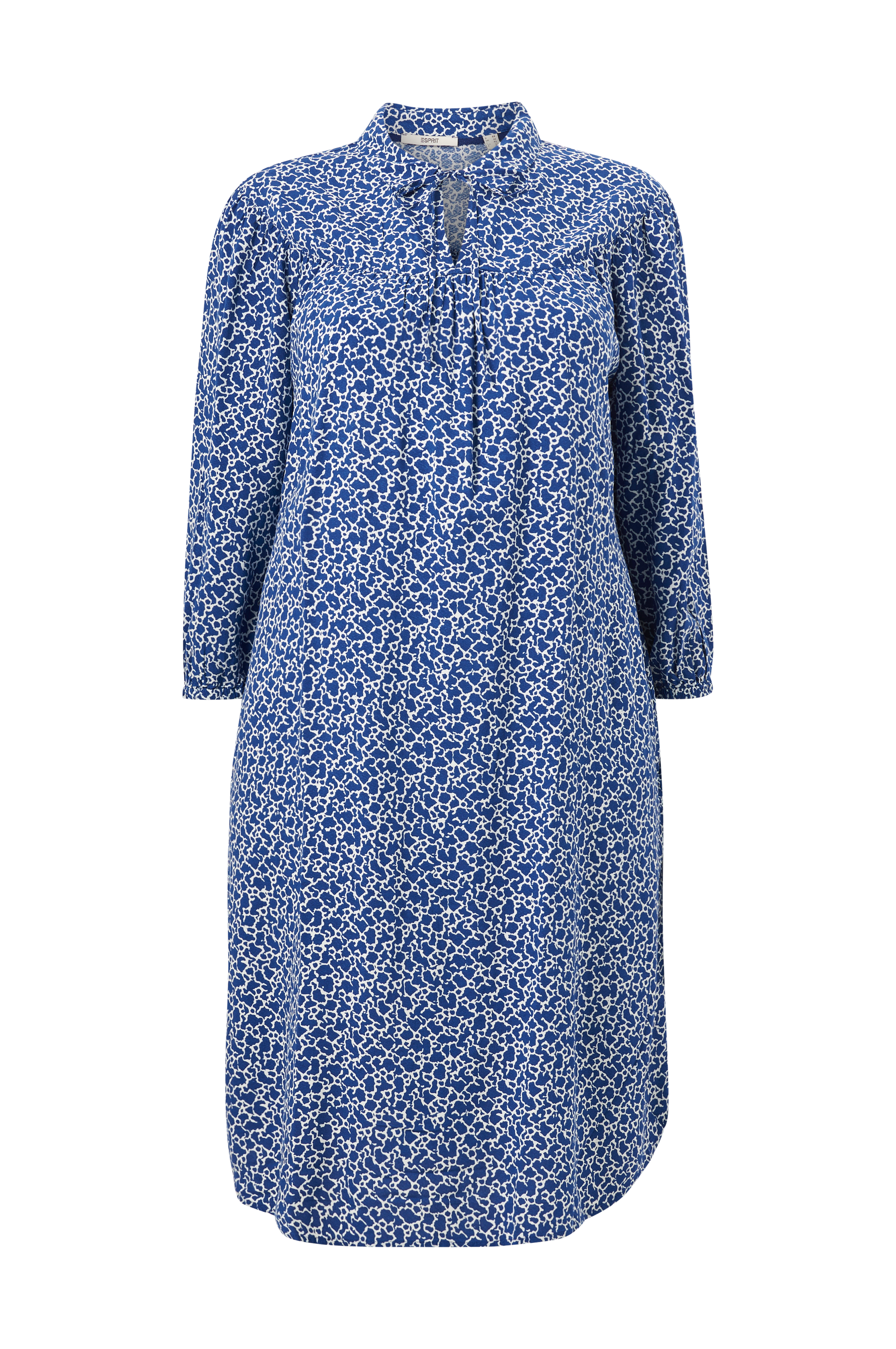• Midikjole • Halsudskæring med krave og bindebånd • Samling ved brystet • Noget bredere ærmer • Lommer i siderne • Store størrelser • Længde: 112 cm i størrelse 44