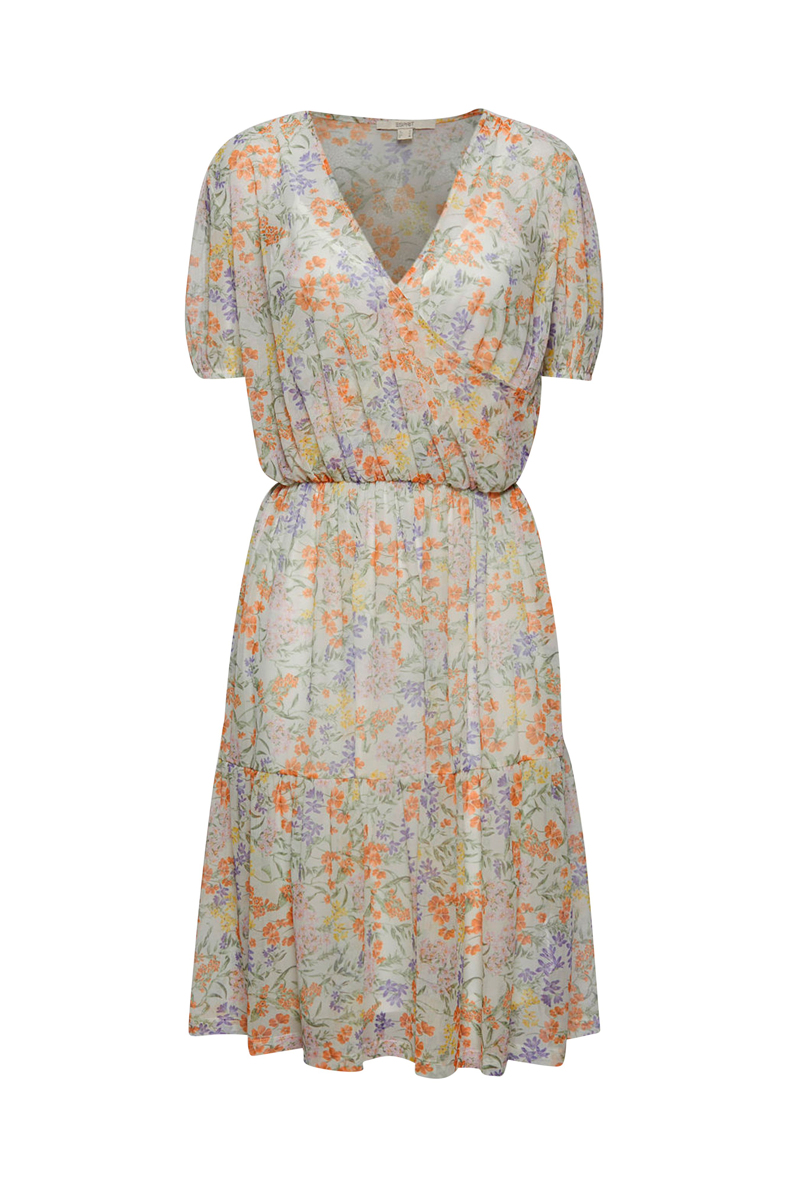 Kjole i let figursyet model af mønstret mesh med slå om-effekt i halsudskæring. rynkning foran på skuldrene og kort pufærme med rynkning ved skulderen og indsat elastik i ærmekant. Afskæring med indvendig elastik i taljen og vidde i nederdelen med påsyet flæse forneden. Aftagelig underkjole i jersey som har smalle, regulerbare skulderstropper, V-formet halsudskæring og ligeskåret ryg. Længde ca. 109 cm i str. S.