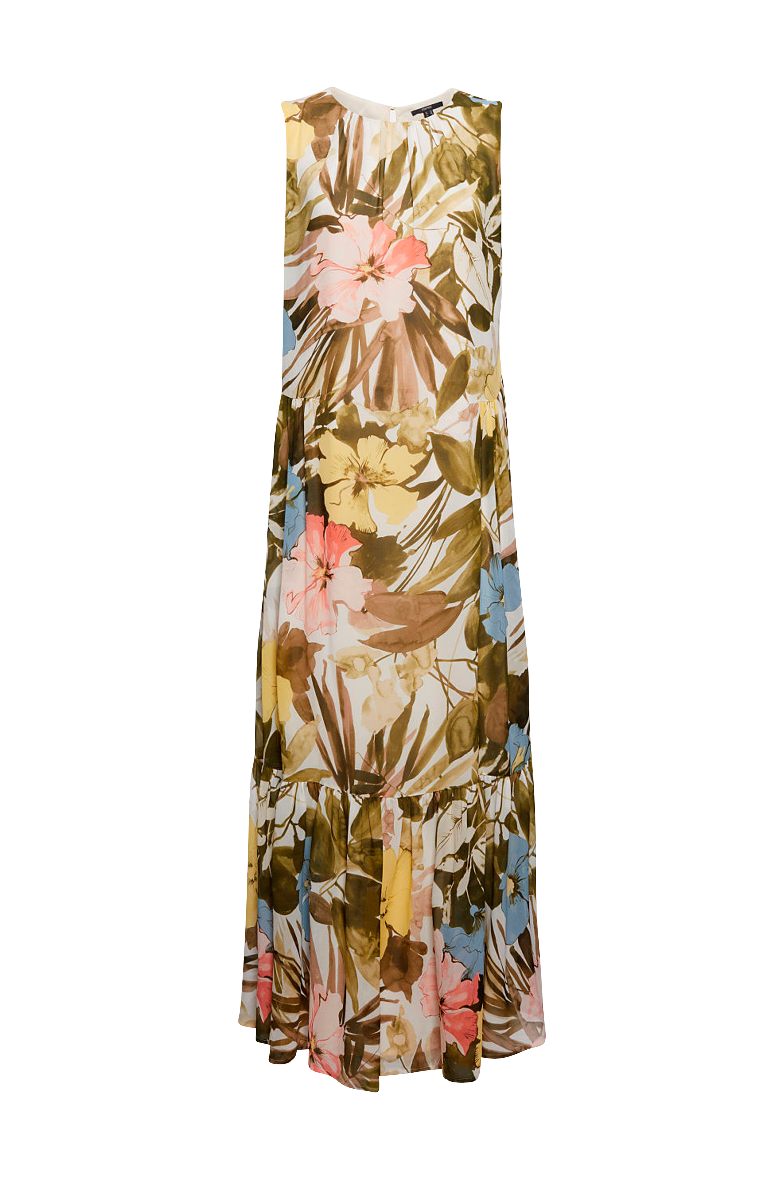 Blomstret maxikjole i A-formet model med flæse forneden. Rund hals med rynkning foran. Slids og knap bagpå. Skjult lynlås i ryggen. I chiffon. Foret. Længde ca. 138 cm i str. 36.