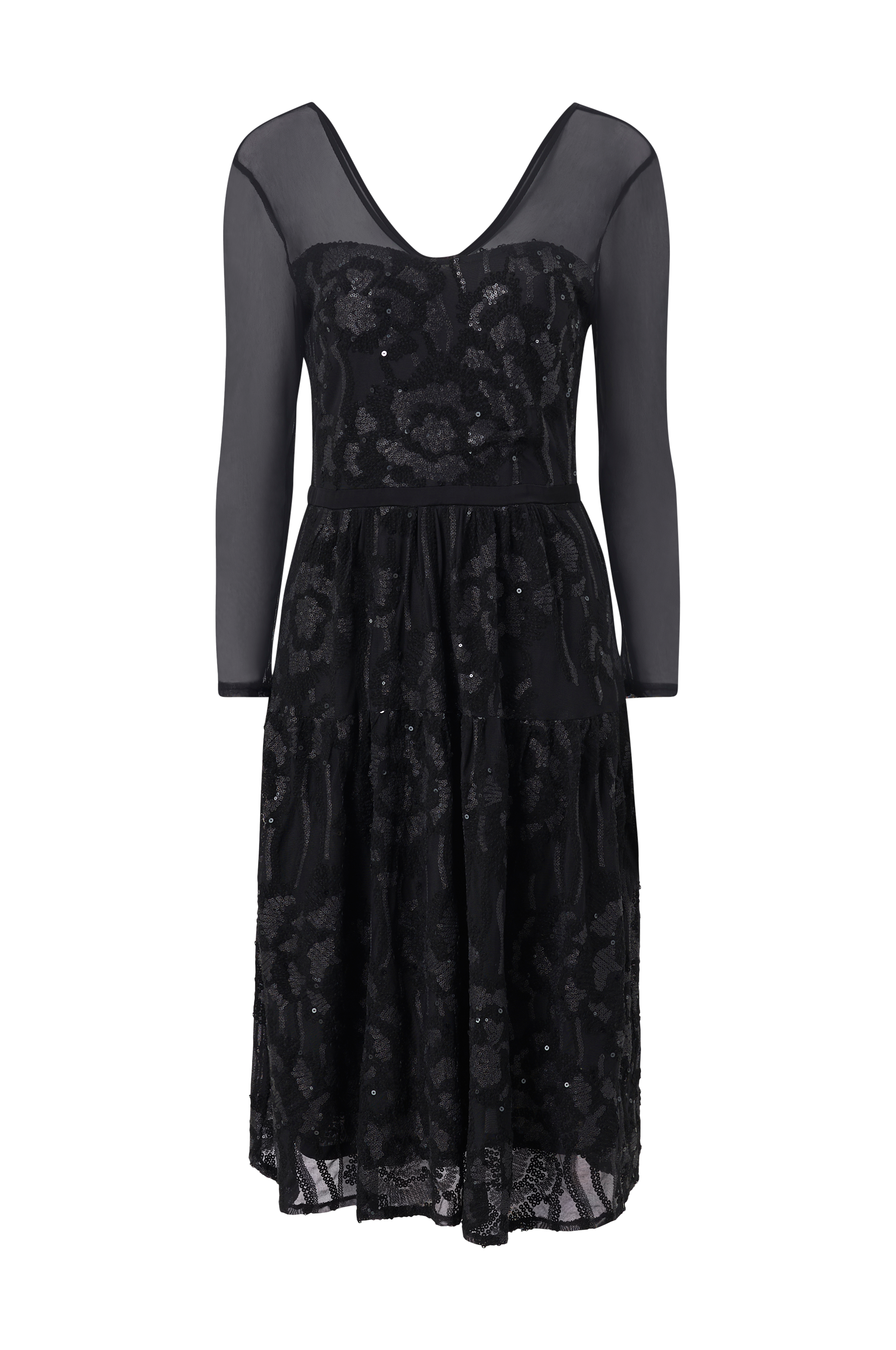 • Festkjole med pailleter• V-udskæring foran og bagpå• Lange ærmer i mesh• Lynlås i ryggen• Fremstillet af mesh med pailleter• Trikotfor• Længde: 112 cm i størrelse S