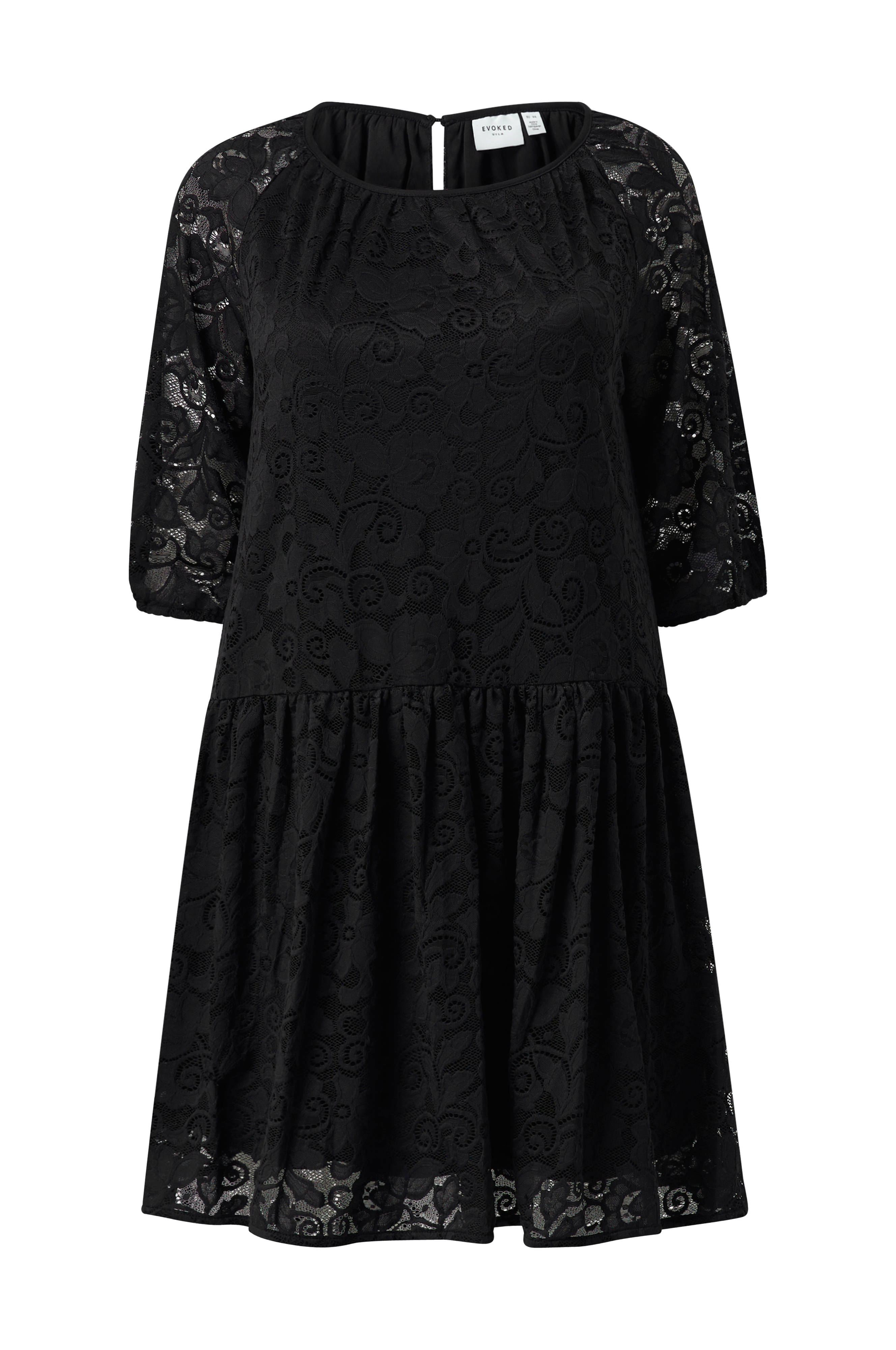 • Kjole i elastisk blonde• Rund hals med samling• Ventilation med knap i nakken• 3/4 lange, transparente ærmer• Trikotfor• Store størrelser• Længde: 99 cm i størrelse 44
