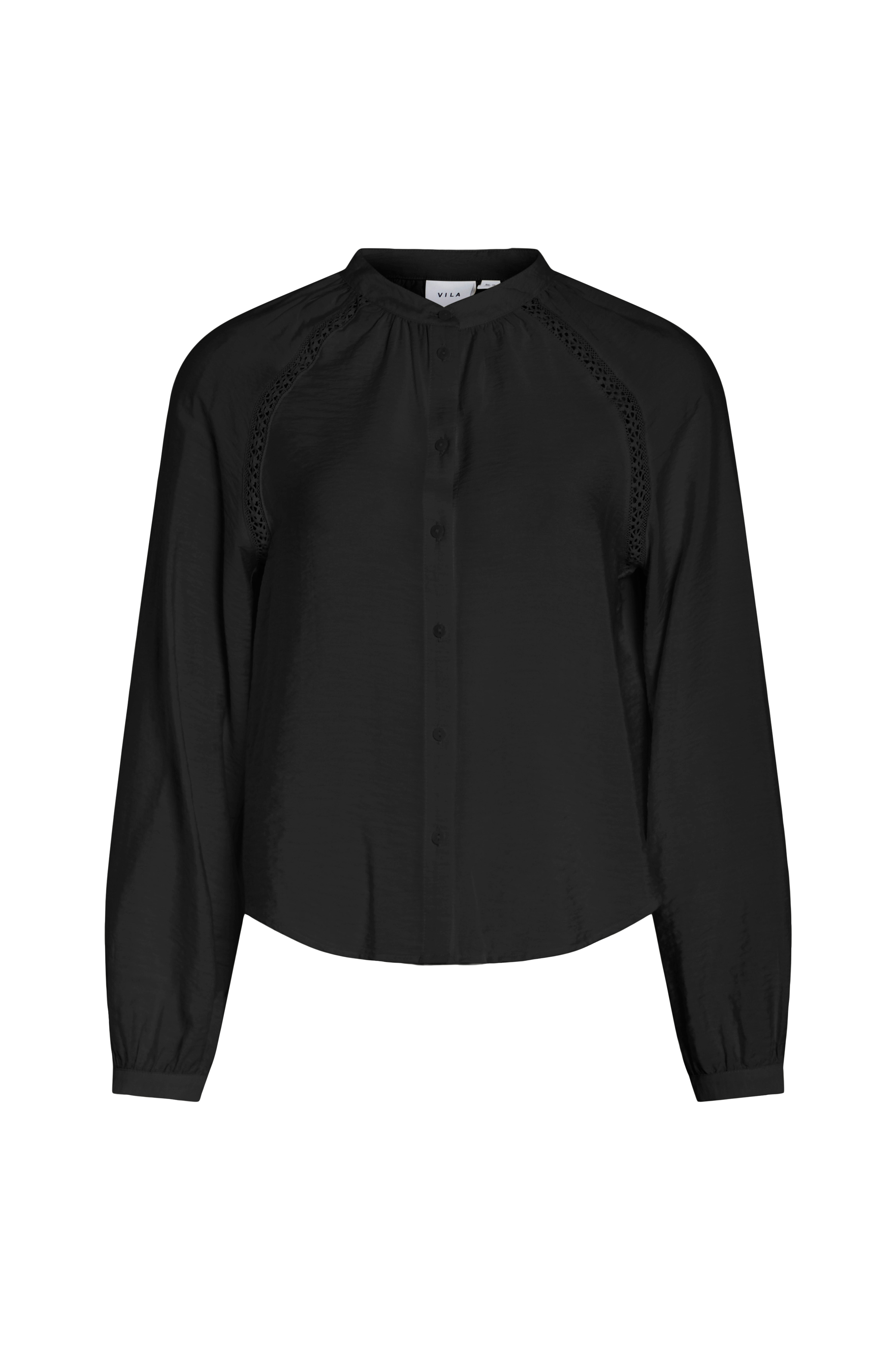 • Model i crepe• Rund hals• Knapper foran• Blondeindlæg på skuldrene• Langt ærme med tynd manchet