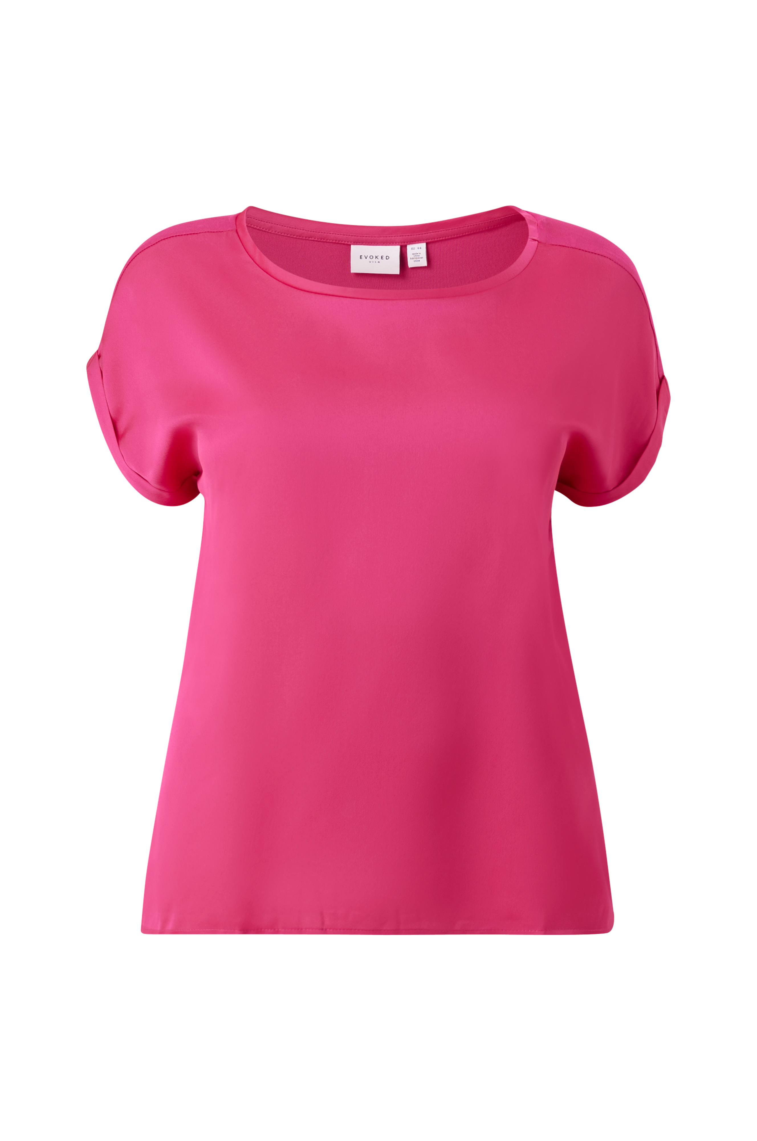 • Store størrelser• Lige model med vævet forside• Jersey bagpå• Rund, bred halsudskæring• Nedsænket skulder med kort ærme og oprullet ved manchetterne