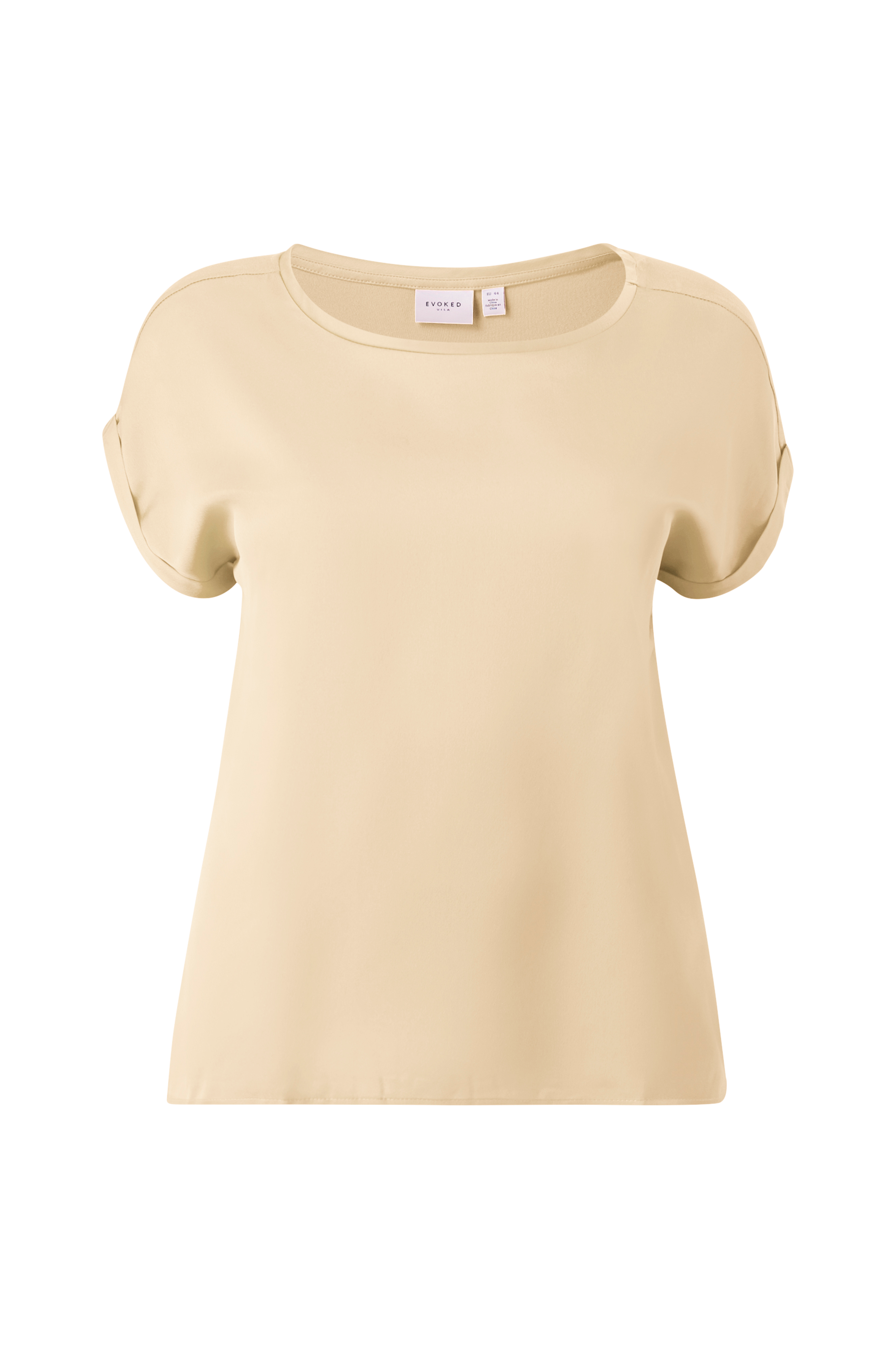 • Store størrelser• Lige model med vævet forside• Jersey bagpå• Rund, bred halsudskæring• Nedsænket skulder med kort ærme og oprullet ved manchetterne