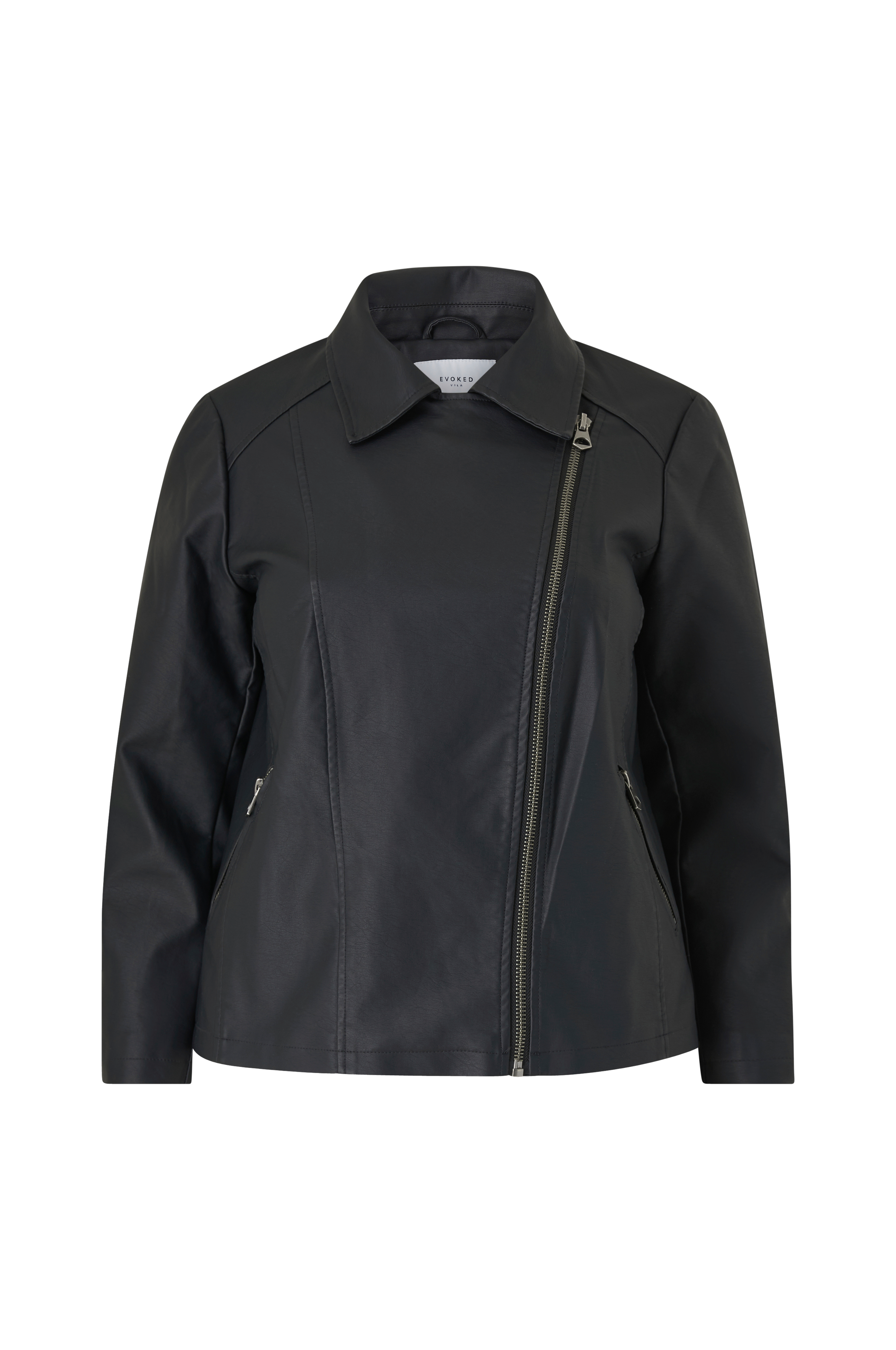 • Bikerjakke i imiteret læder• Asymmetrisk lynlås• To lommer med lynlås• Lynlås ved ærmeafslutningerne• Vævet, glat for• Store størrelser• Længde: 64 cm i størrelse 44