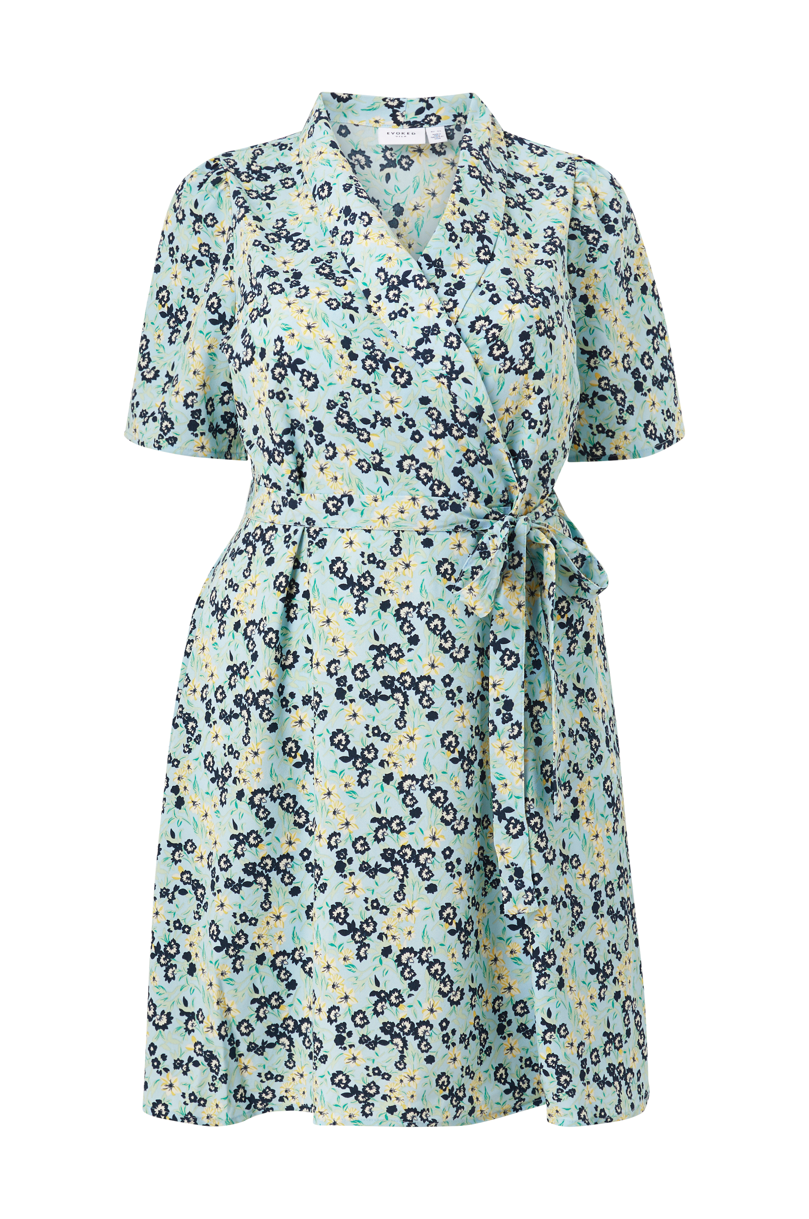 • Draperet slå-om design på toppen• Kort ærme• Aftageligt bindebælte ved taljen• Store størrelser• Længde: 102 cm i størrelse 44