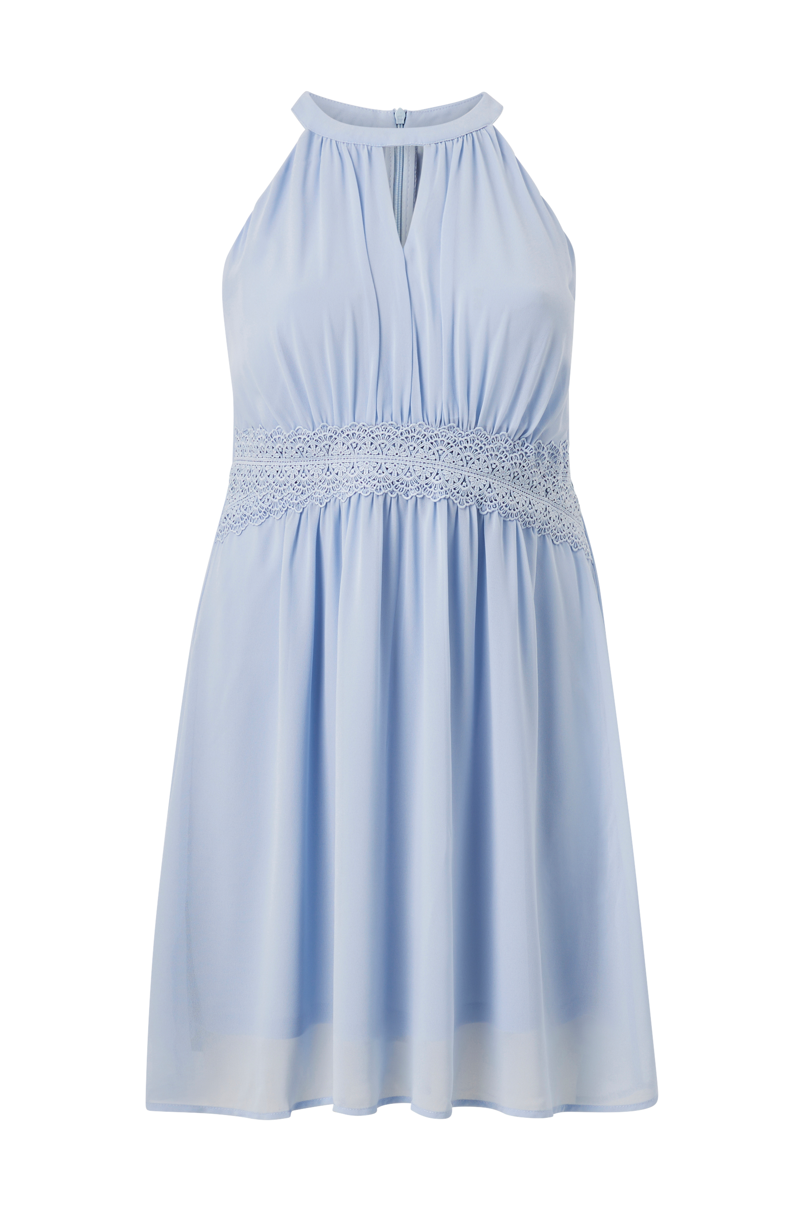 • Kjole i chiffon • Halterneckdesign med åbning foran • Skjult lynlås i ryggen • Defineret talje med blonde foran • Foret • Store størrelser • Længde: 104 cm i størrelse 44 • Produktet indeholder genindvundet materiale, som genbruges for at reducere mængden af affald samtidigt med at der ikke anvendes nye ressourcer.