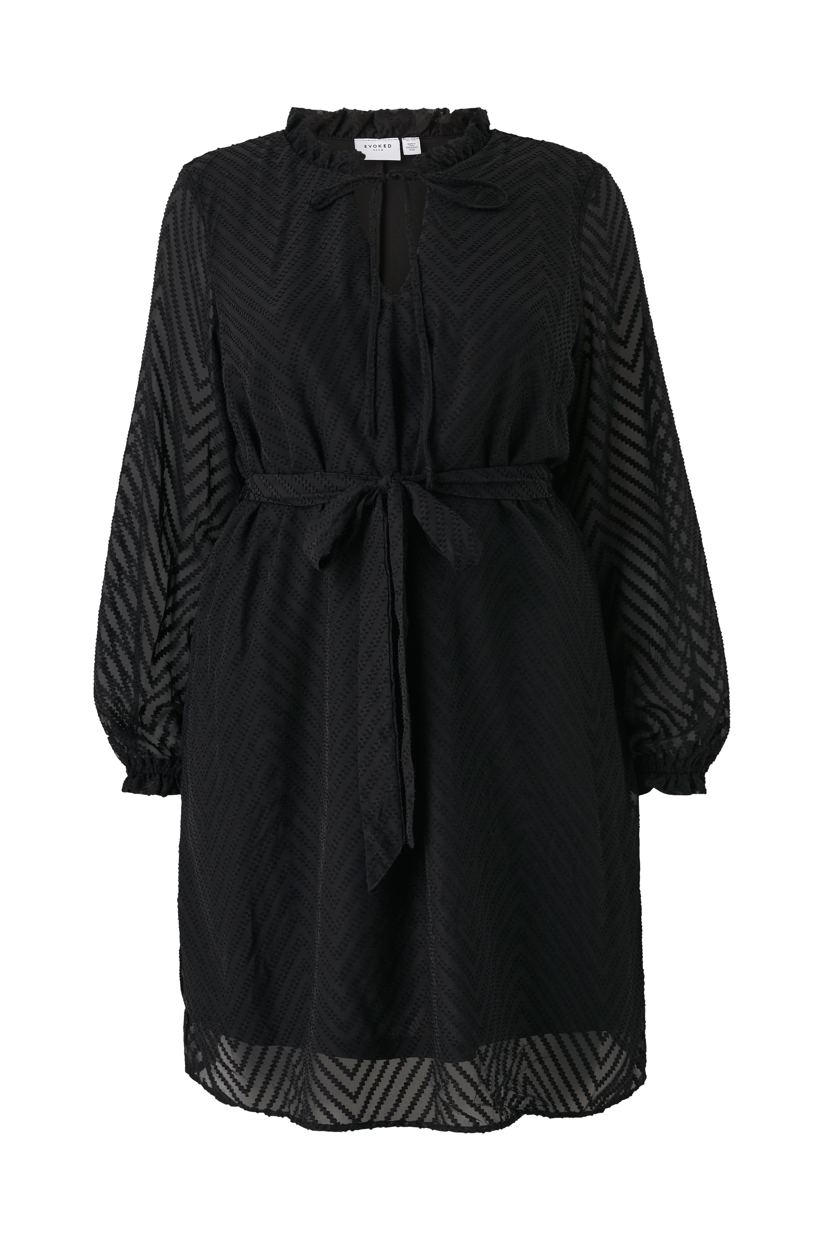 • Store størrelser • Mønstervævet model med svaj • Volant i nakken med bindebånd i halsen • Langt, bredt ærme med elastisk bånd nederst • Bindebælte ved taljen • Foret • Længde: 102 cm i størrelse 44 • Produktet indeholder genindvundet materiale, som genbruges for at reducere mængden af affald samtidigt med at der ikke anvendes nye ressourcer.