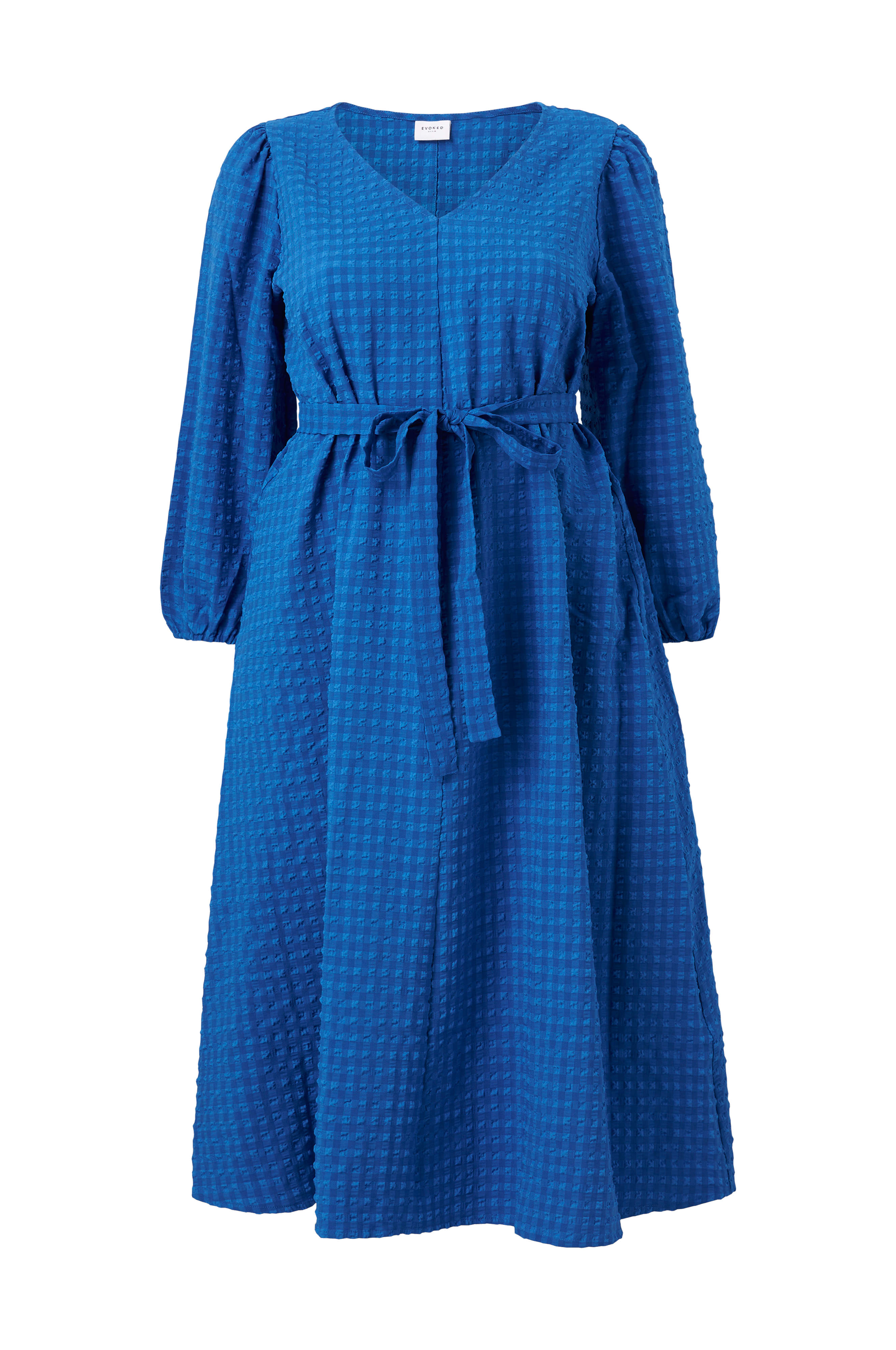 • Store størrelser• Bred model med svaj• Mønstervævet kvalitet• V-udskæring• Bredt ballonærme med elastisk bånd ved manchetterne• Bindebælte ved taljen• Længde: 121 cm i størrelse 44