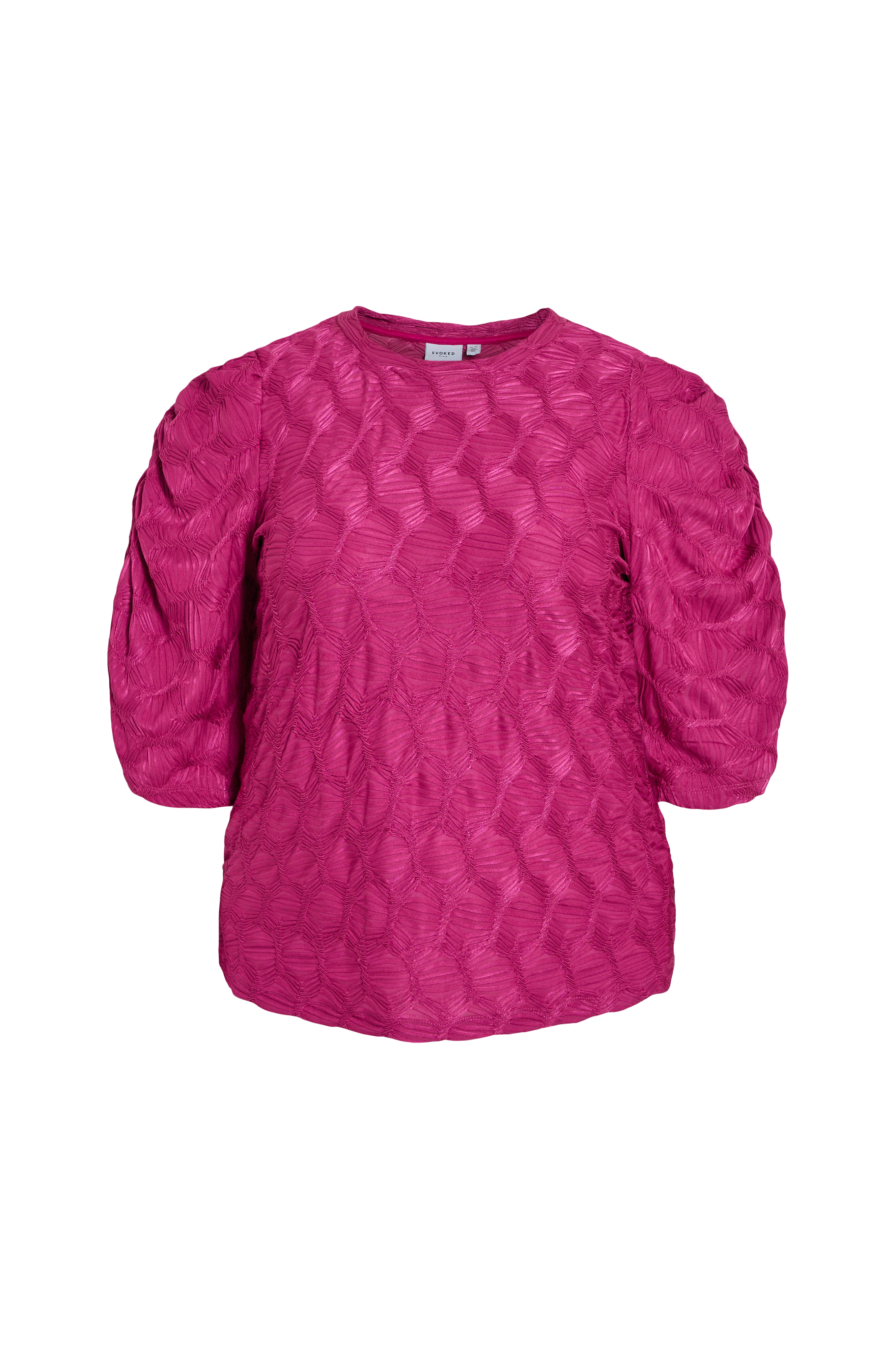 • Let figurformet, mønstervævet model• Rund hals• Bredt, halvlangt ballonærme med elastisk drapering på oversiden