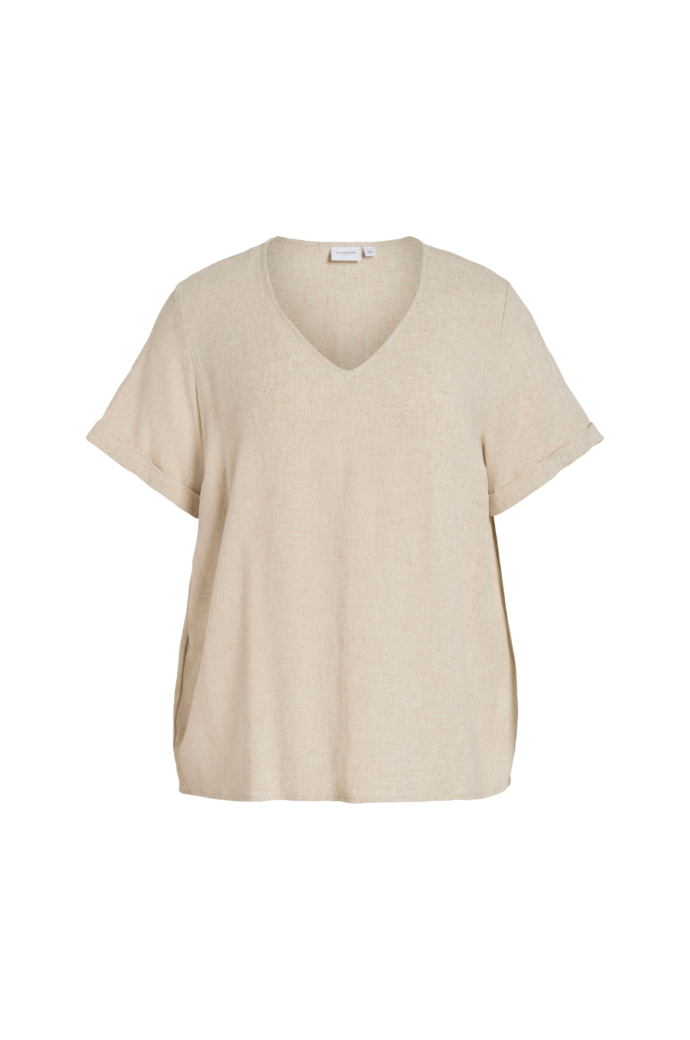• Store størrelser• Lige model• Vævet kvalitet• V-formet halsudskæring• Kort ærme med oprullet