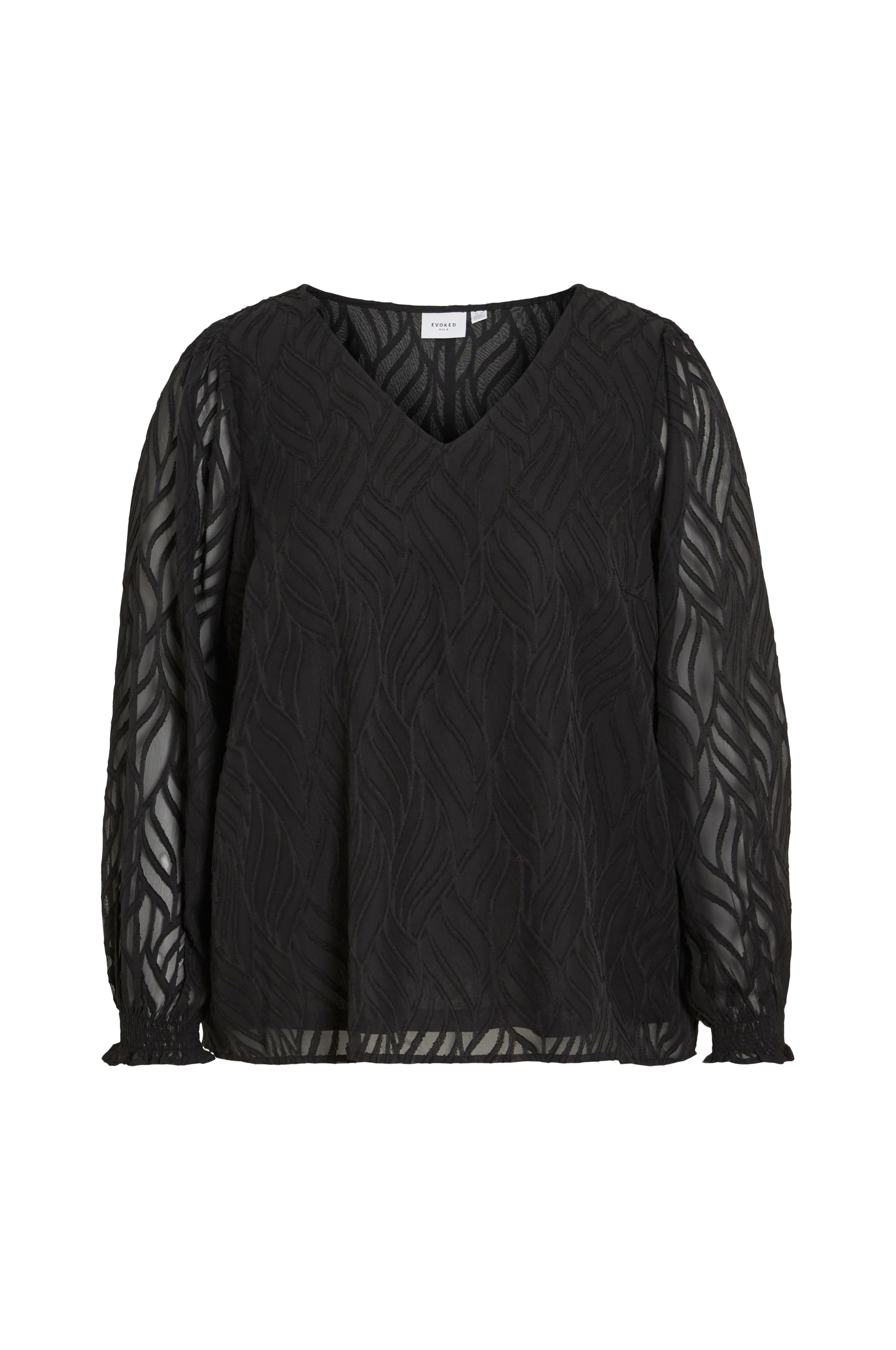 • Store størrelser• Lige, mønstervævet model i chiffon• V-formet halsudskæring• Bredt ballonærme med elastiksømme nederst• Foret