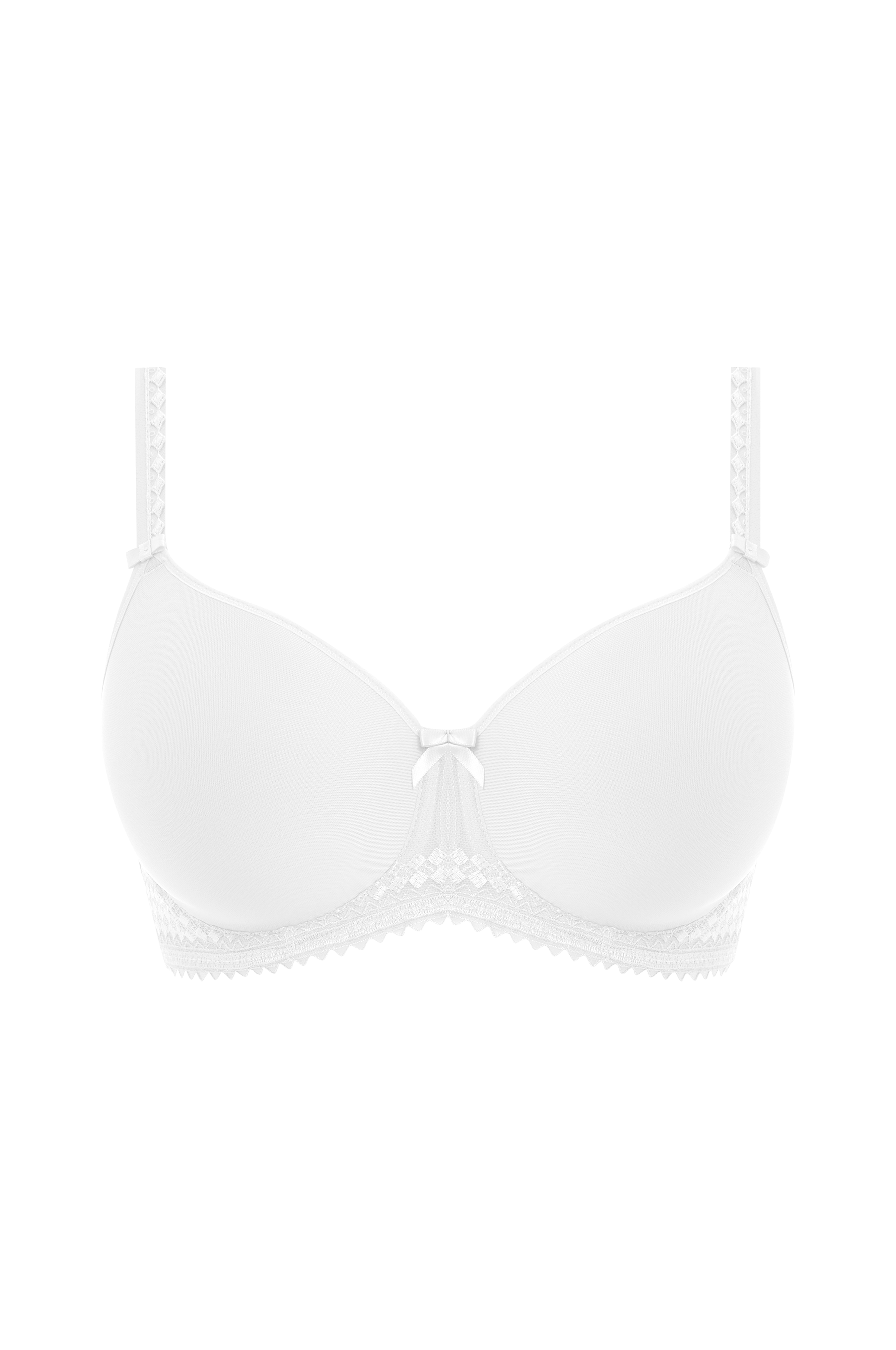 Bh Rebecca fra Fantasie i dejlig model med bøjle og formpressede skåle i materiale som kan ånde. Broderet mesh i kanten forneden, i siderne og på skulderstropperne samt sød blondekant.