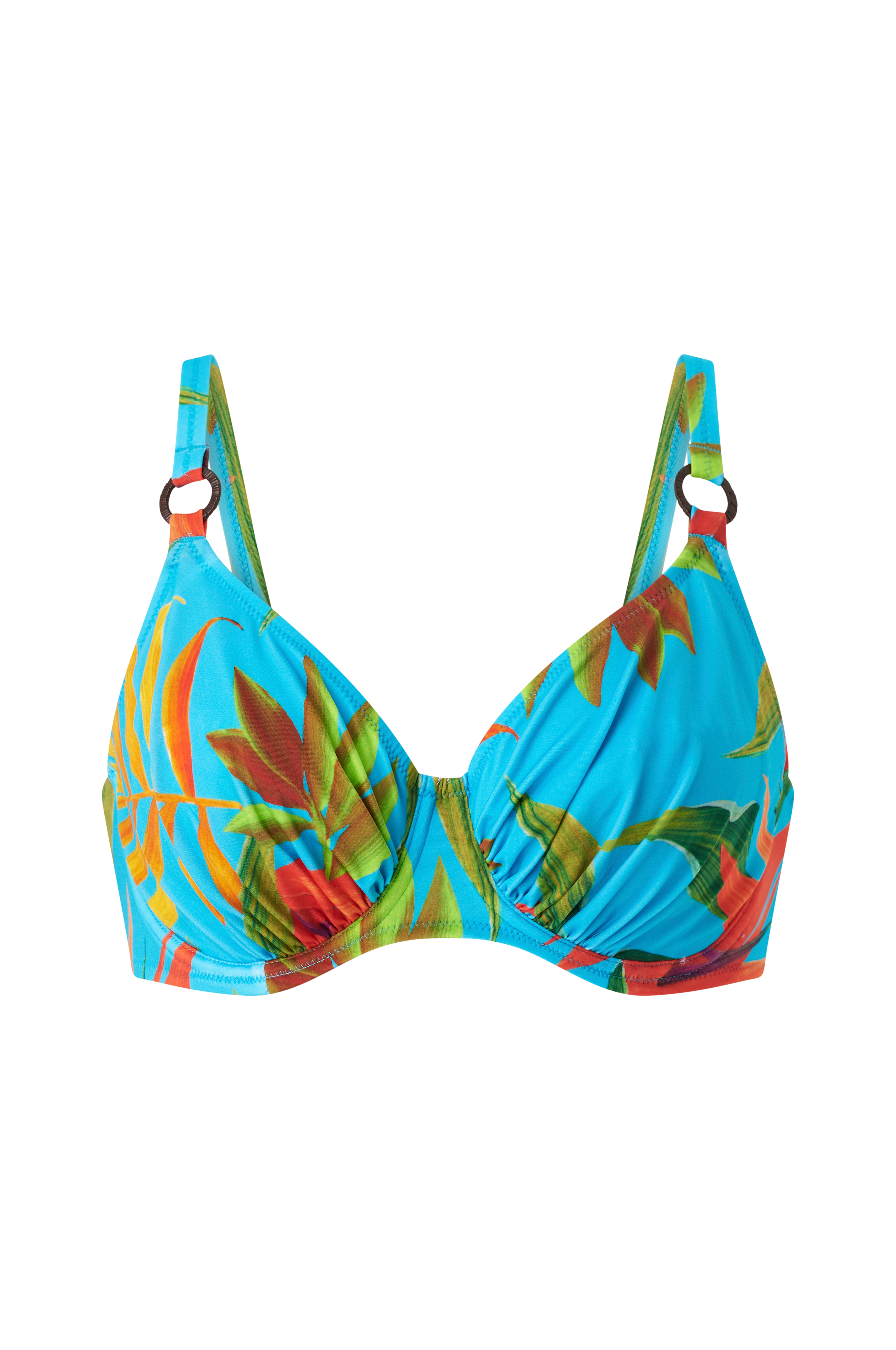 • Bikini-bh i polyamid-blanding med tropisk mønster med foret skål og bøjle• Justérbare skulderstropper med ringdetalje foran• Spænde i ryggen