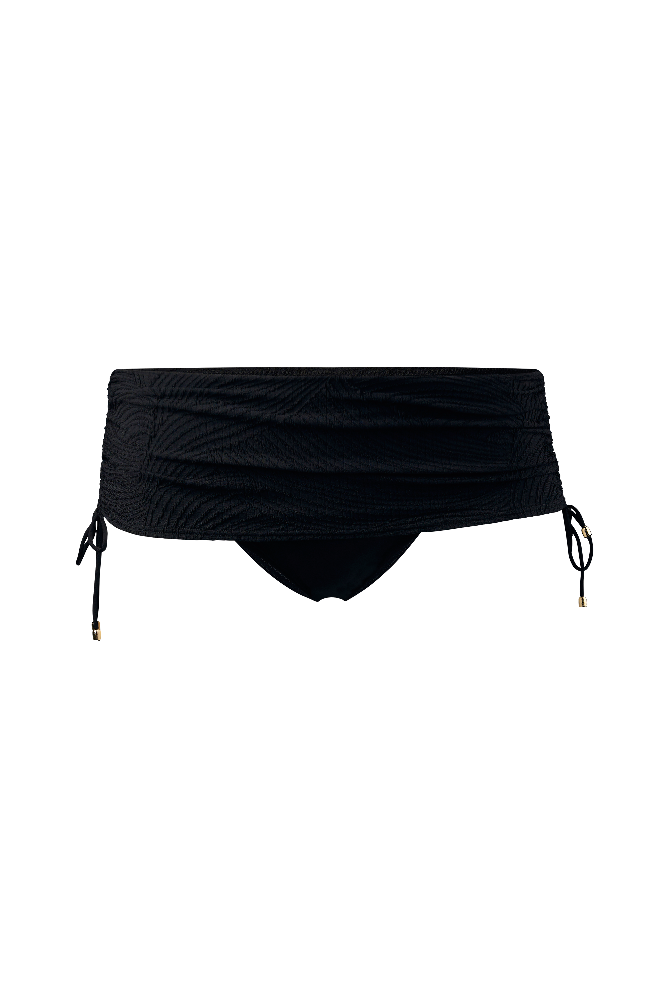 Bikinibuks med nederdel Ottawa Adjustable Skirted Brief fra Fantasie. Skøn, lidt højere bikinibuks med nederdel udenpå i struktur, og som har justerbar højde med draperinger i siderne. Helforet. Blød stretchjersey. Højde i siden (uden drapering) ca. 21 cm i str. M.