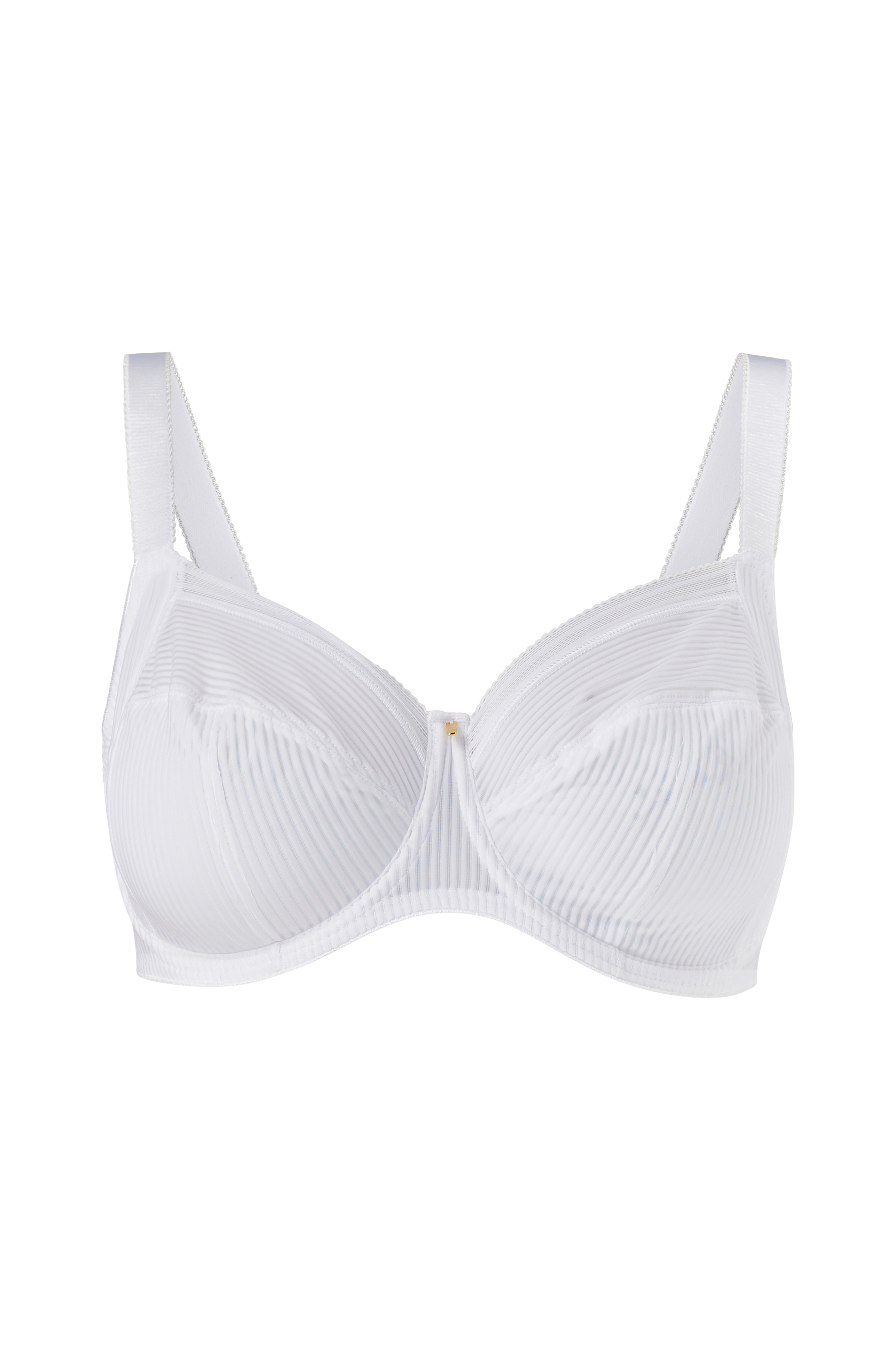 Bøjle-bh Fusion Full Cup Side Support fra Fantasie med tredelte skåle og ekstra støtte i siderne som løfter og former fint. I tynd kvalitet med strukturstriber og blondekant foroven. Skålene er tynde og uden vattering, nærmest lidt transparente. Stabiliserende powermesh i siderne og bagpå. Lille guldfarvet detalje mellem skålene. Justerbare skulderstropper og hægte- og mallelukning i ryggen.