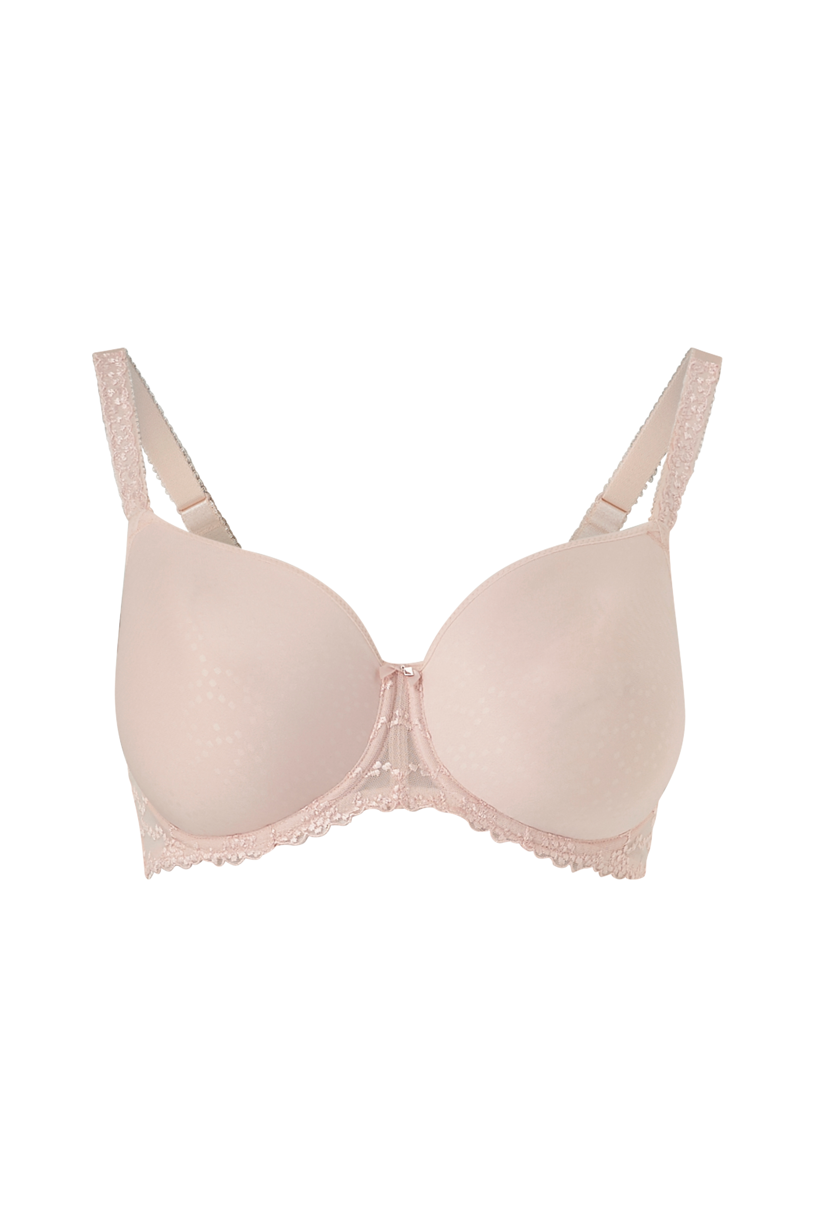 T-shirt-bh Ana fra Fantasie med formpressede, heldækkende skåle i let materiale med diskret mønster. Blondebeklædt bøjle som giver fint løft. Justerbare skulderstropper med broderi foran samt hægte- og mallelukning bagpå.
