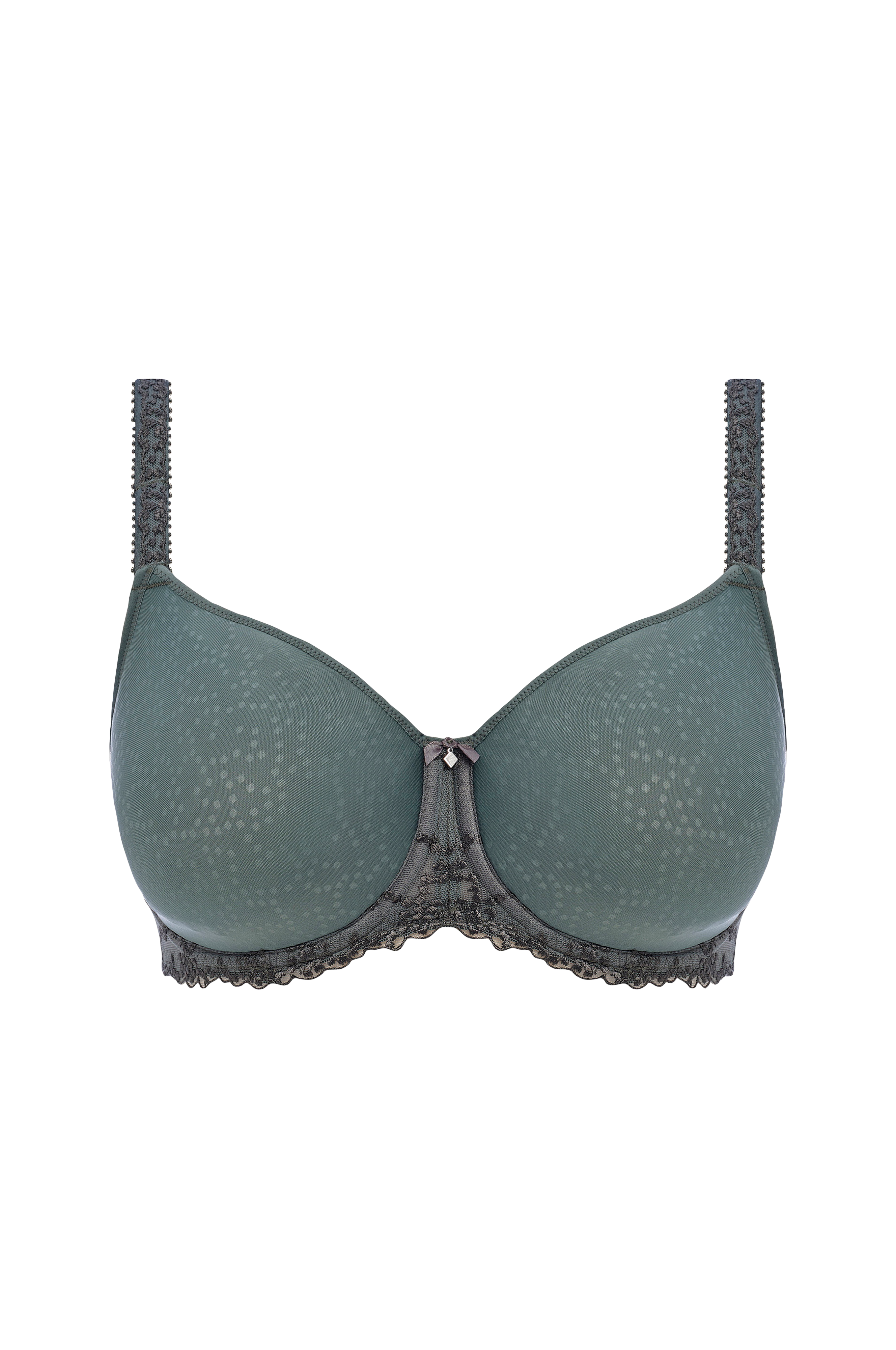 T-shirt-bh Ana fra Fantasie med formpressede, heldækkende skåle i let materiale med diskret mønster. Blondebeklædt bøjle som giver fint løft. Justerbare skulderstropper med broderi foran samt hægte- og mallelukning bagpå.