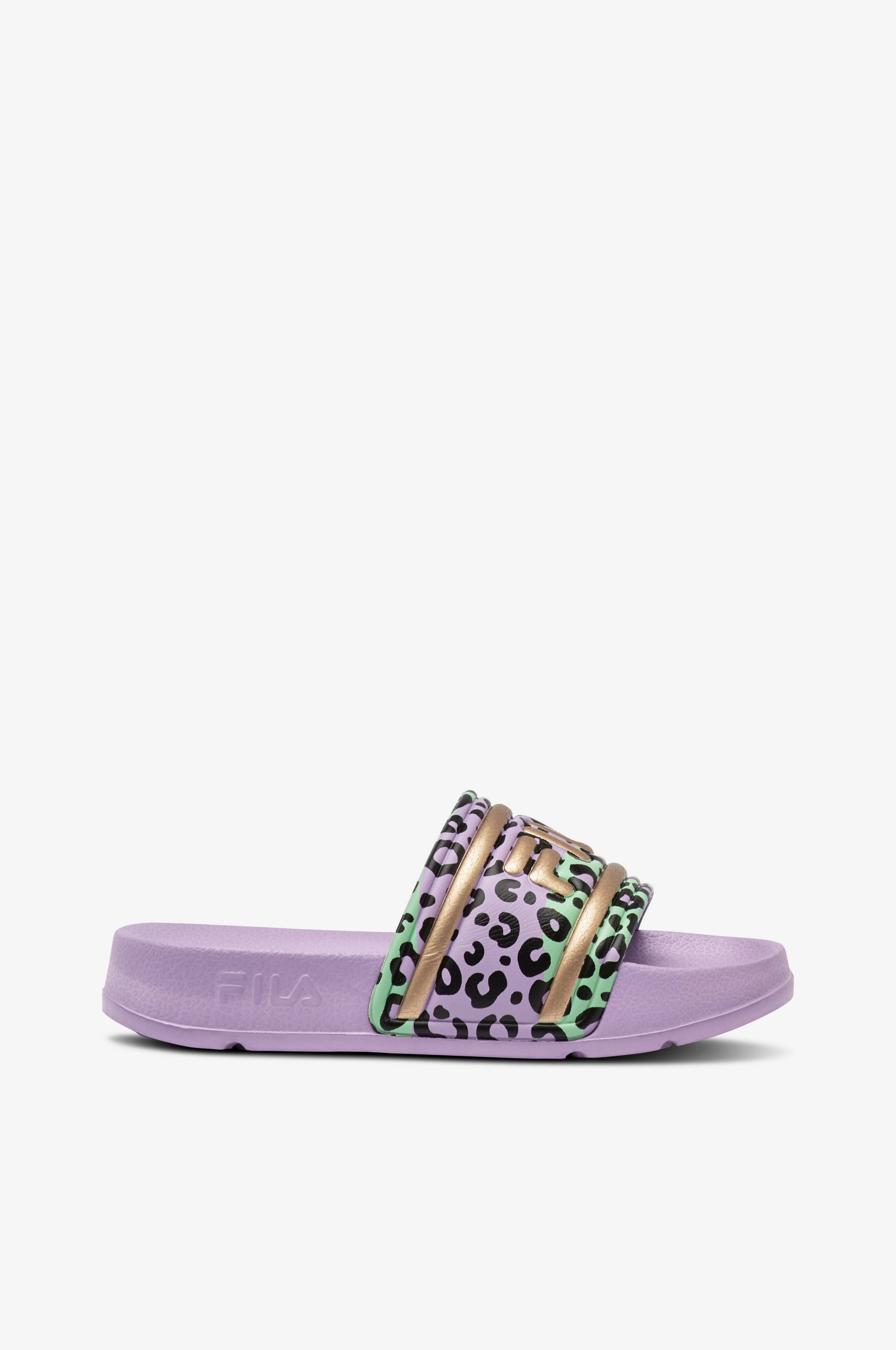 Badetøfler med blød, formet fodseng og bred rem med præget logo.