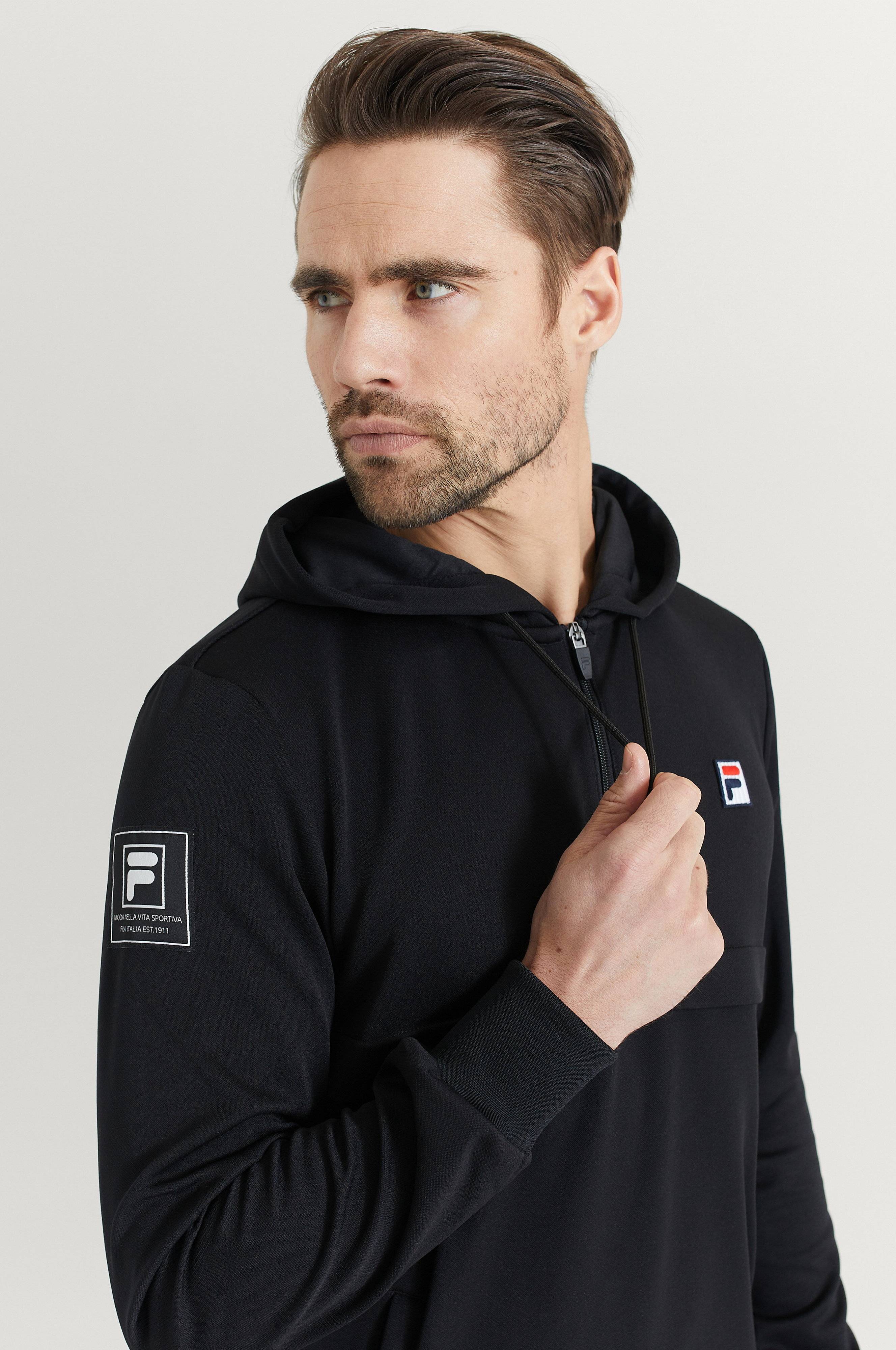Hoodie fra Fila i behagelig kvalitet. Hoodien har hætte med justerbar løbegang og broderet løbegang på kanten forneden. Ribkant i ærmekant og kant forneden samt normal pasform. Hoodien har kængurulomme.