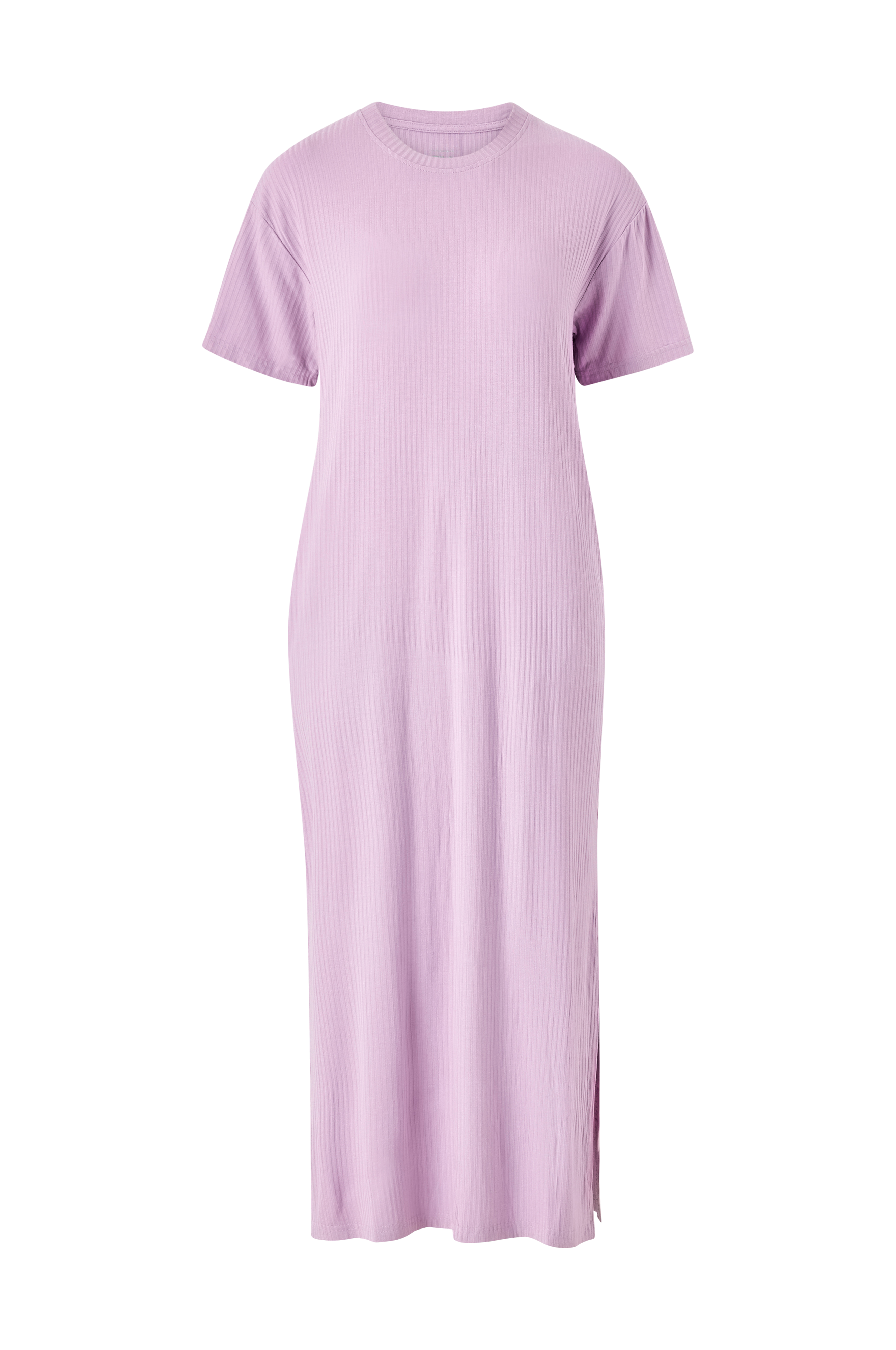 • Lang, ribbet t-shirtkjole i viskosejersey• Korte ærmer• Lommer i siderne• Slidser nederst• Længde: 132 cm i størrelse S