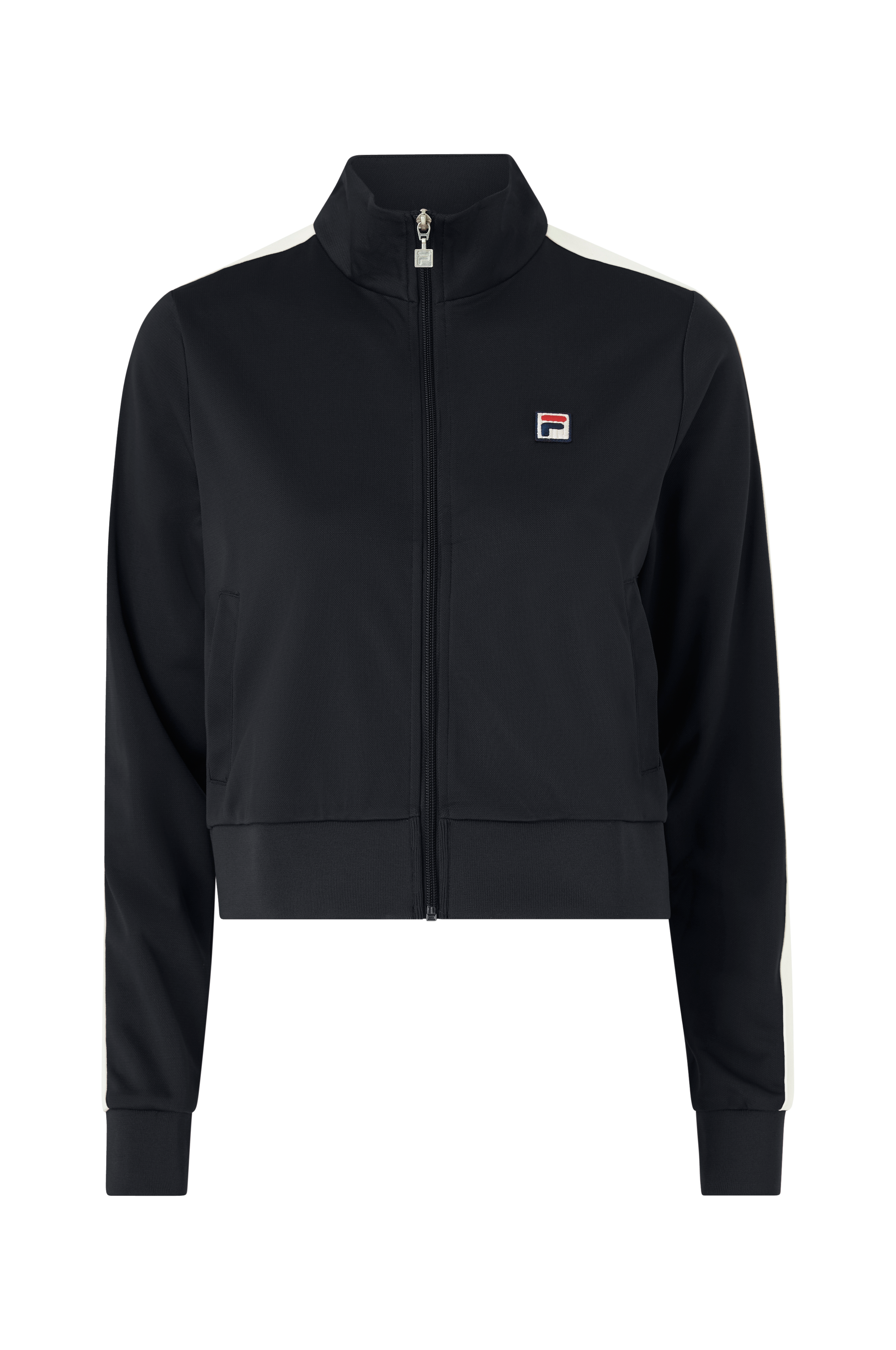 • Skinnende stof• Opretstående krave• Lynlås• To lommer• Ribmanchetter ved manchetterne og nederst