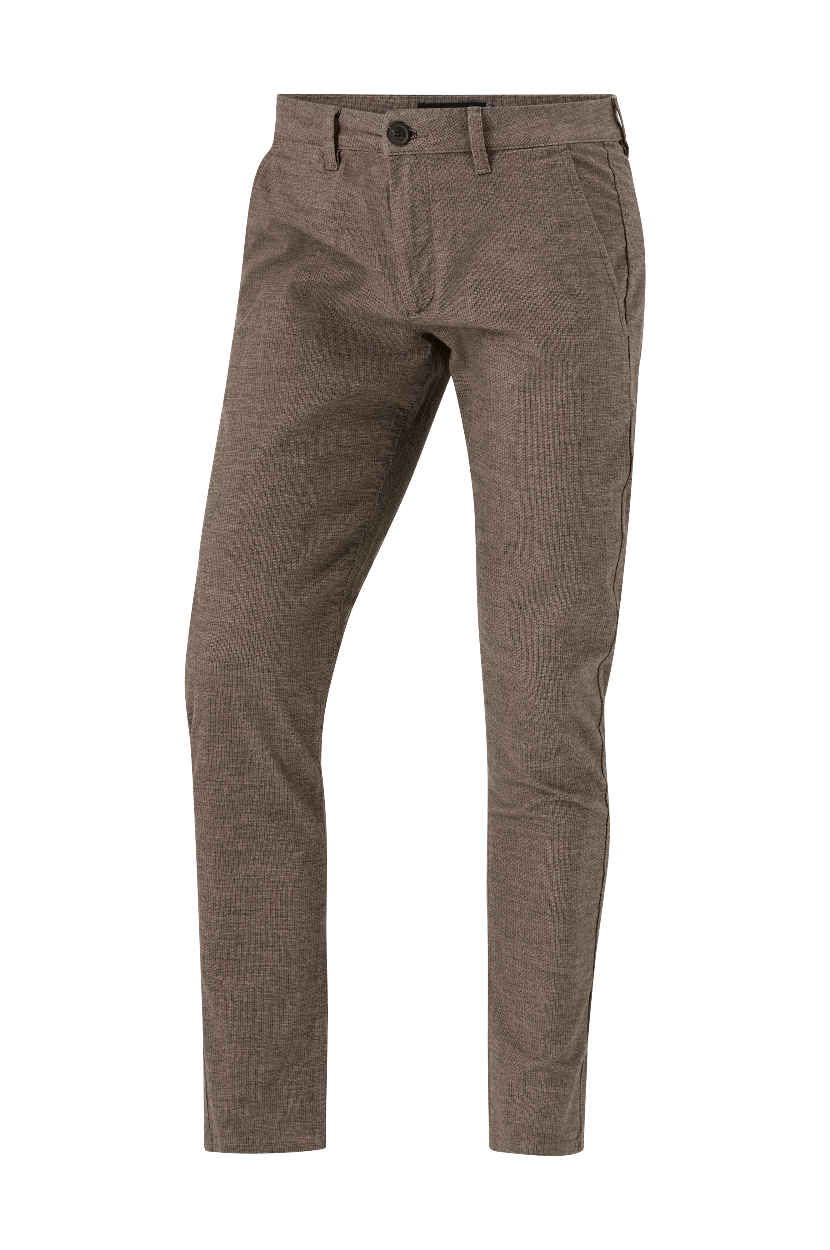 Bukser i stretchkvalitet med diskret mønster og blød vask. Linning med stropper og knap. Gylp med lynlås. To lommer foran og to indsatte baglommer med knap.