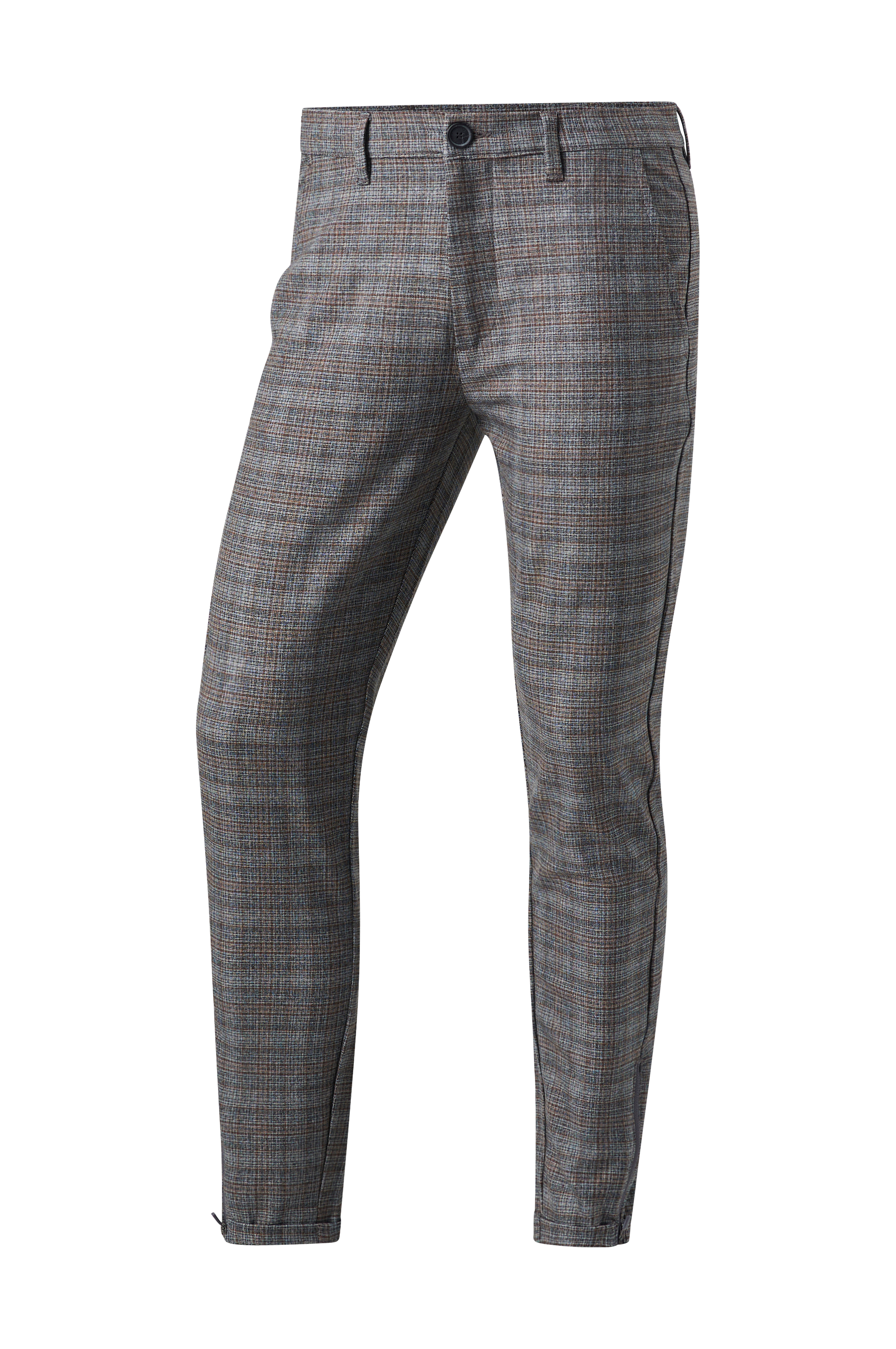 Chinosmodel i behagelig stretchkvalitet med diskret mønster. Linning med stropper, knap og gylp med lynlås. Syet opslag i benkanten med lynlås. To lommer foran og to indsatte baglommer. Benlængde ca. 70 cm i str. M.