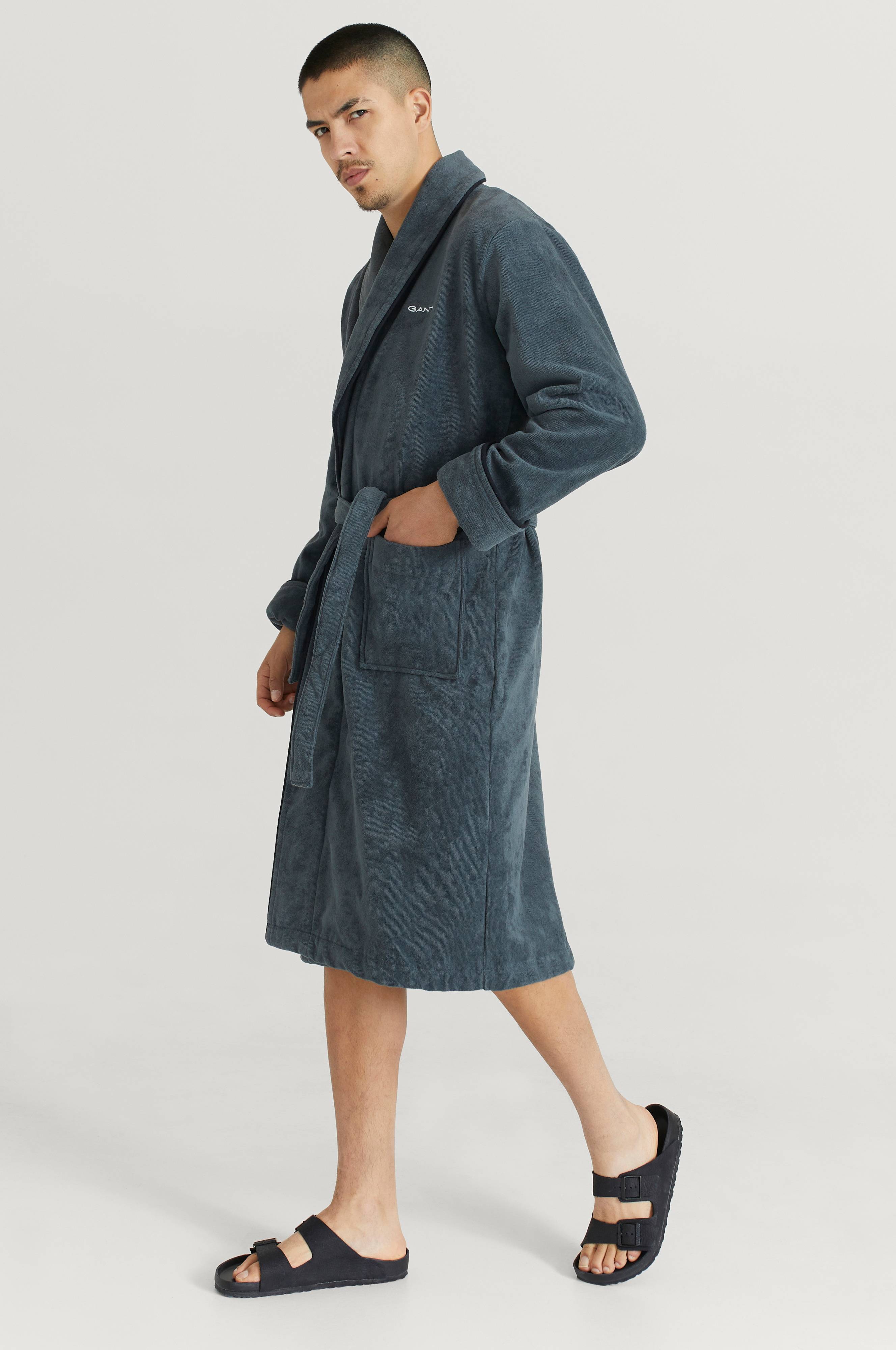 En badekåbe fremstillet i en frotté af 100% økologisk bomuld som føles og ser ud som velour. Denne klassiske, luksuriøs badekåbe er unisex og har en kontrastfarvet og dekorativ fyldt paspolering på ærmet samt lommer og åbning foran.