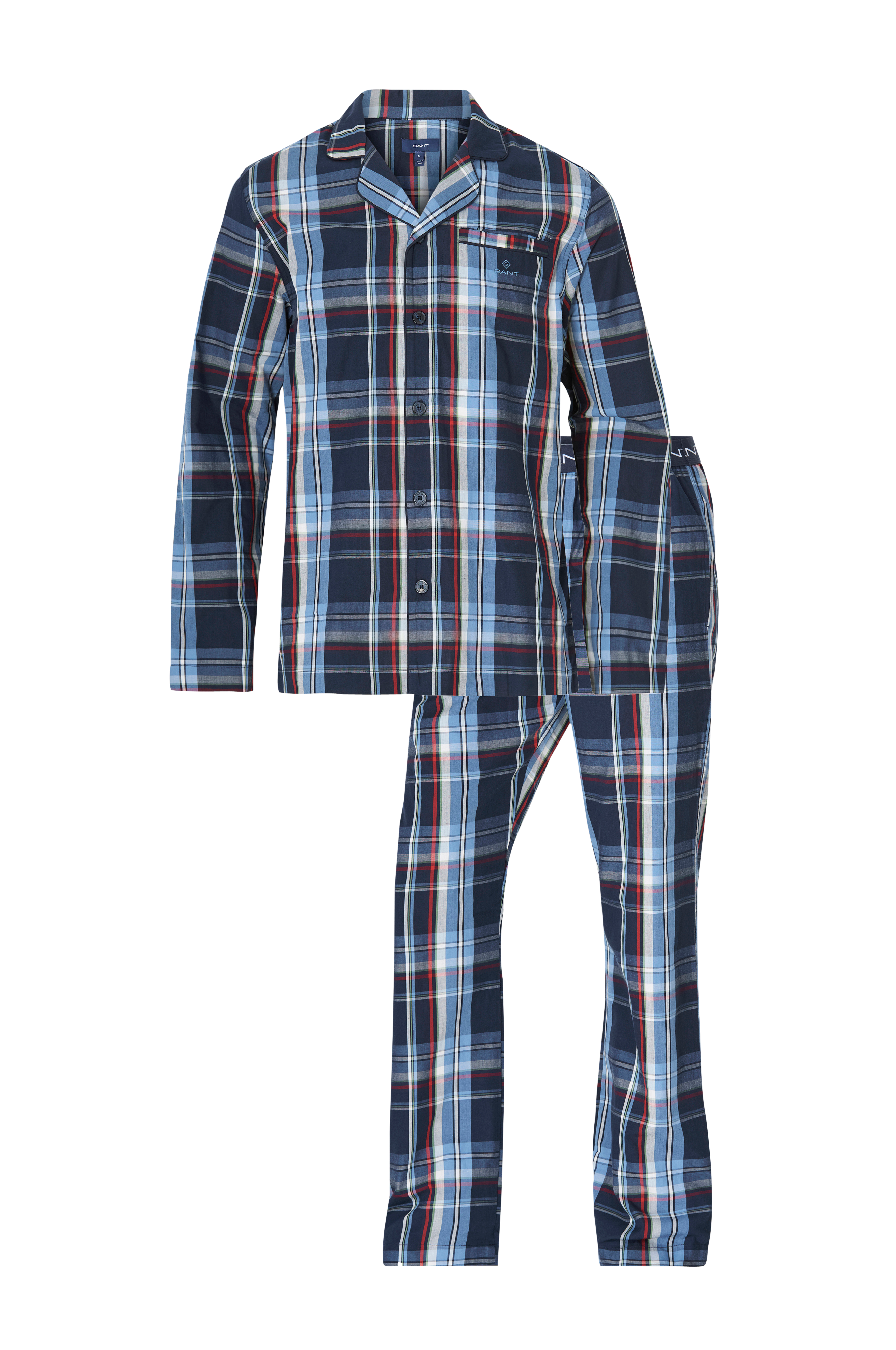 Ternet pyjamas af bomuld. Skjorte med krave og revers. Knapper. En brystlomme med broderet logo. Bukserne har elastiktalje med logo rundt om. To lommer og gylp med en knap.