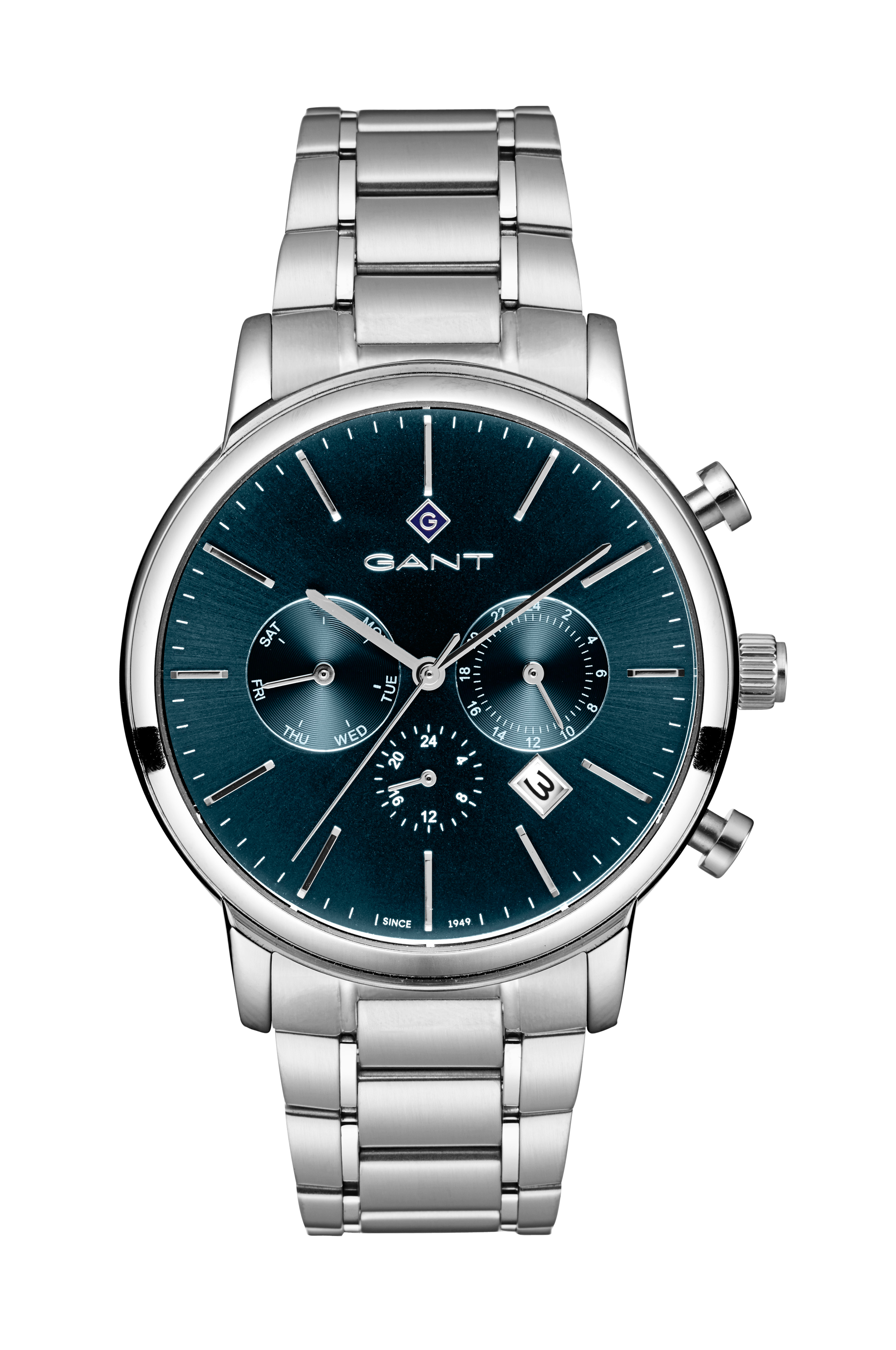Dette 43,5 mm ur fra Gant er det perfekte hverdagsurDet sporty udseende, den tynde urkasse og de fine detaljer gør at det skiller sig ud, men også forbliver tidløst. Day-Date, Dual time og 24-timersfunktion.