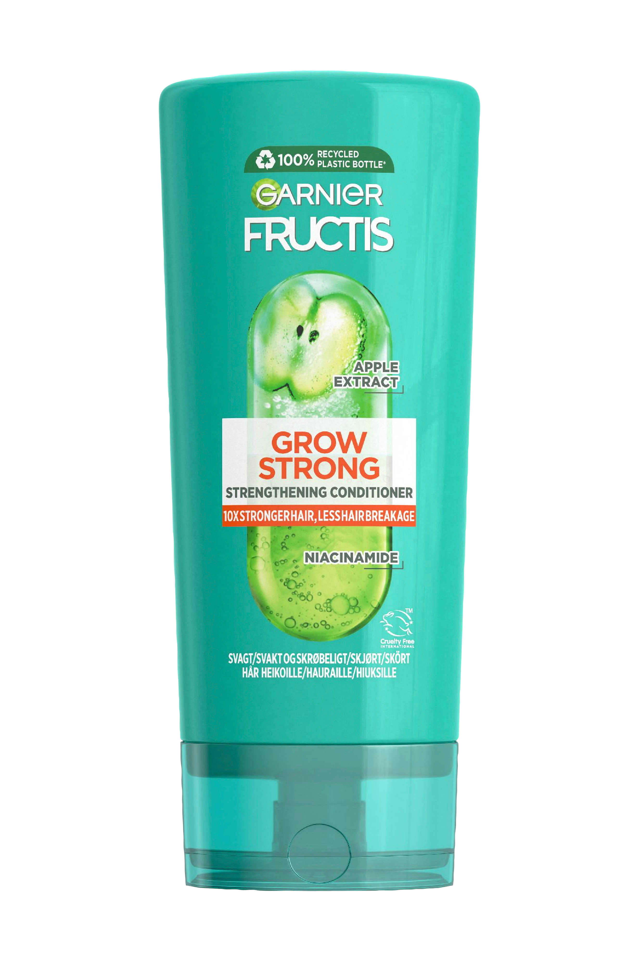 Er du klar til et stærkere hår? Garnier Fructis Grow Strong balsam er udviklet til skrøbeligt hår. Formlen er beriget med æbleekstrakt og niacinamid, og dit hår føles revitaliseret og stærkt. 100% genanvendt plastikflaske** som også er 100% genanvendelig.