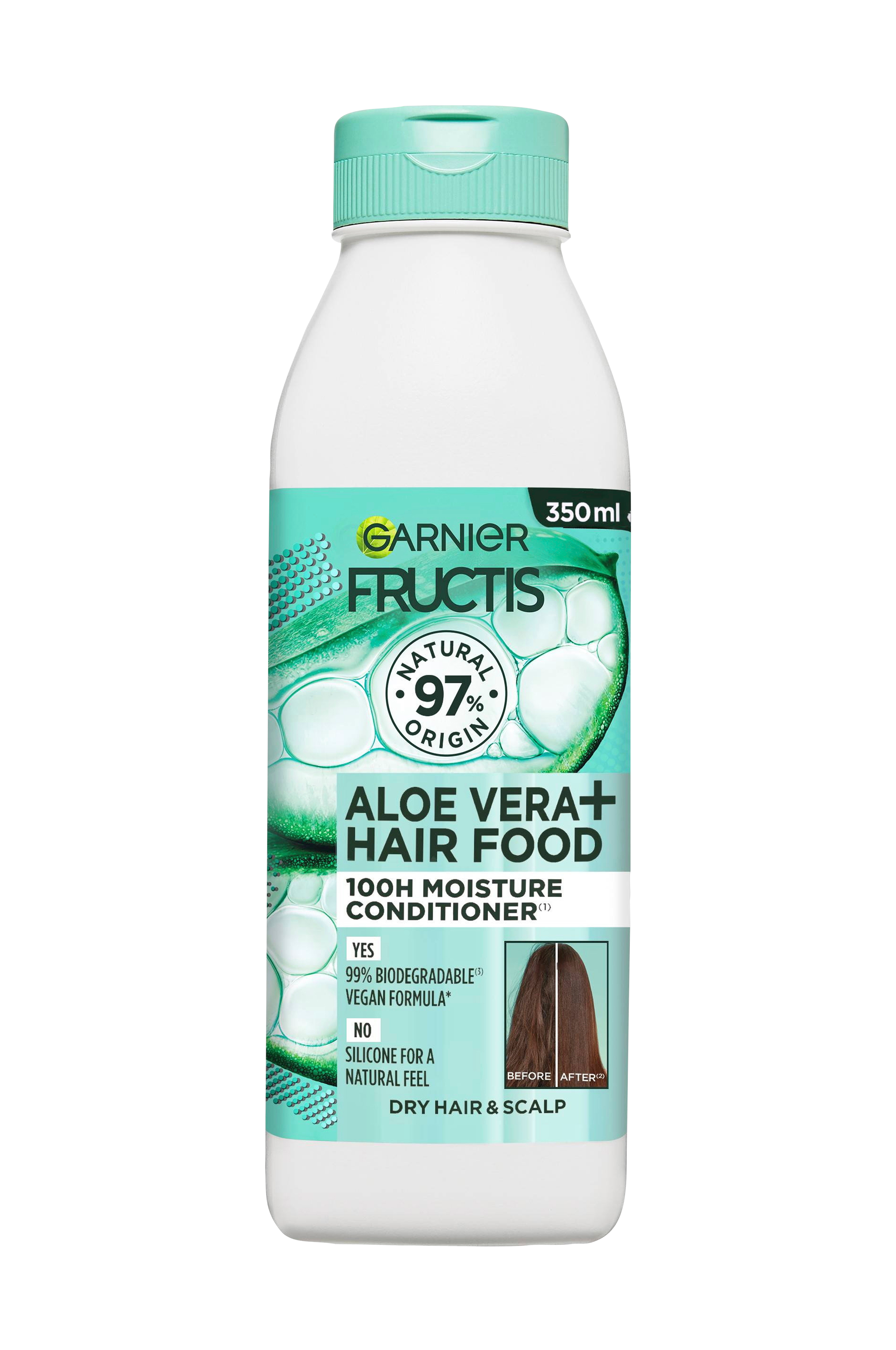 Garnier Fructis Hair Food Aloe Vera conditioner er en fugtgivende balsam som er velegnet til tørt hår og hovedbund. Formlen fugter i 100 timer*, styrker hårfibrene og er beriget med aloe vera samt omega 3, 6, 9 og 4% fedtsyrer. Formel af 97% naturlig oprindelse og som er 99% bionedbrydelig. Testet under dermatologisk kontrol. Fuldend din Hair Food-rutine med shampoo og 3-i-1 hårkur.