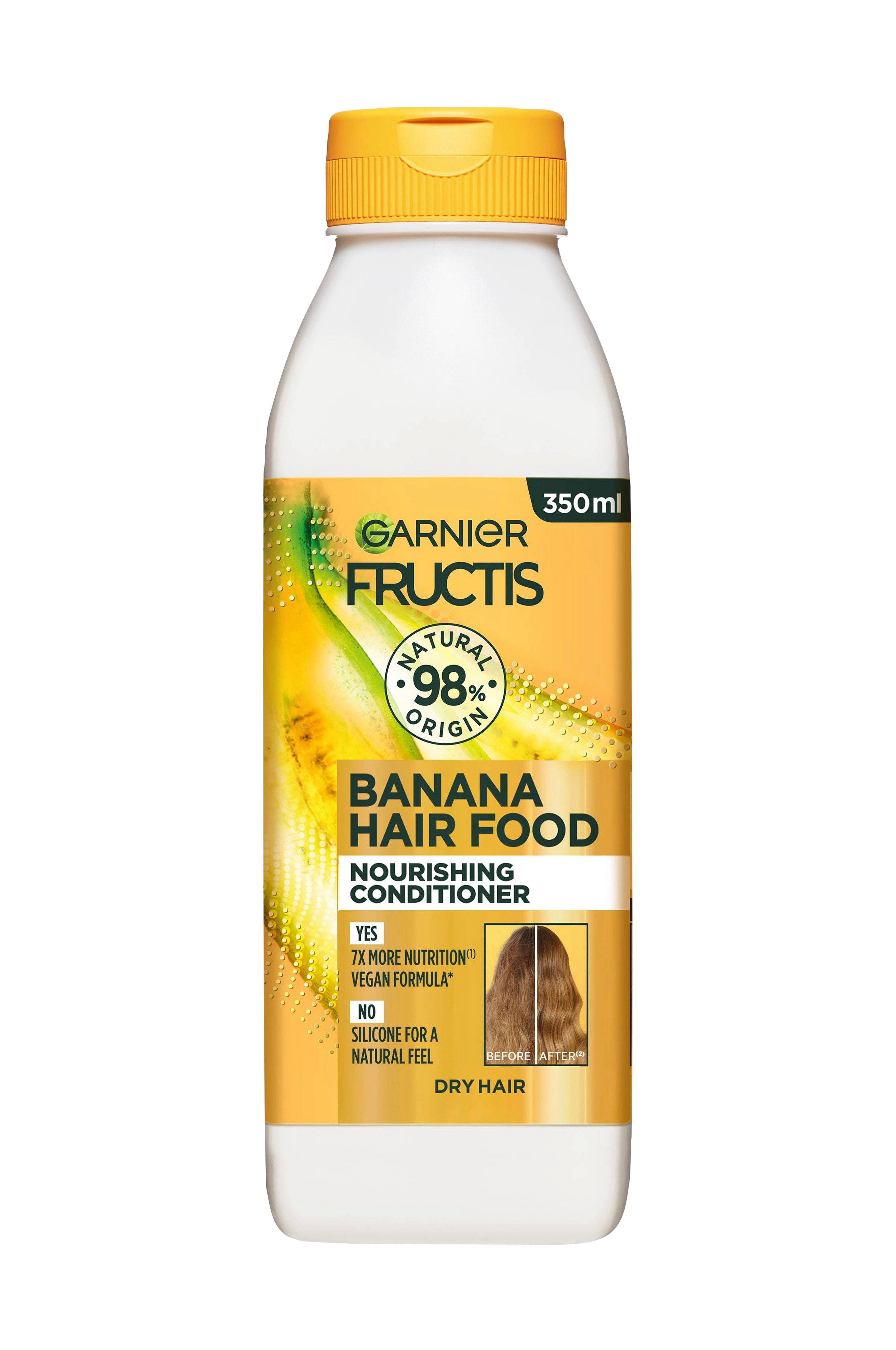 Garnier Fructis Hair Food Bananana nourishing conditioner er en balsam til tørt hår som fugter, styrker hårfiberen og efterlader dit hår med 7X mere næring*. Den veganske formel** er uden silikone for en naturlig følelse og er beriget med omega 3 + 6 + 9.