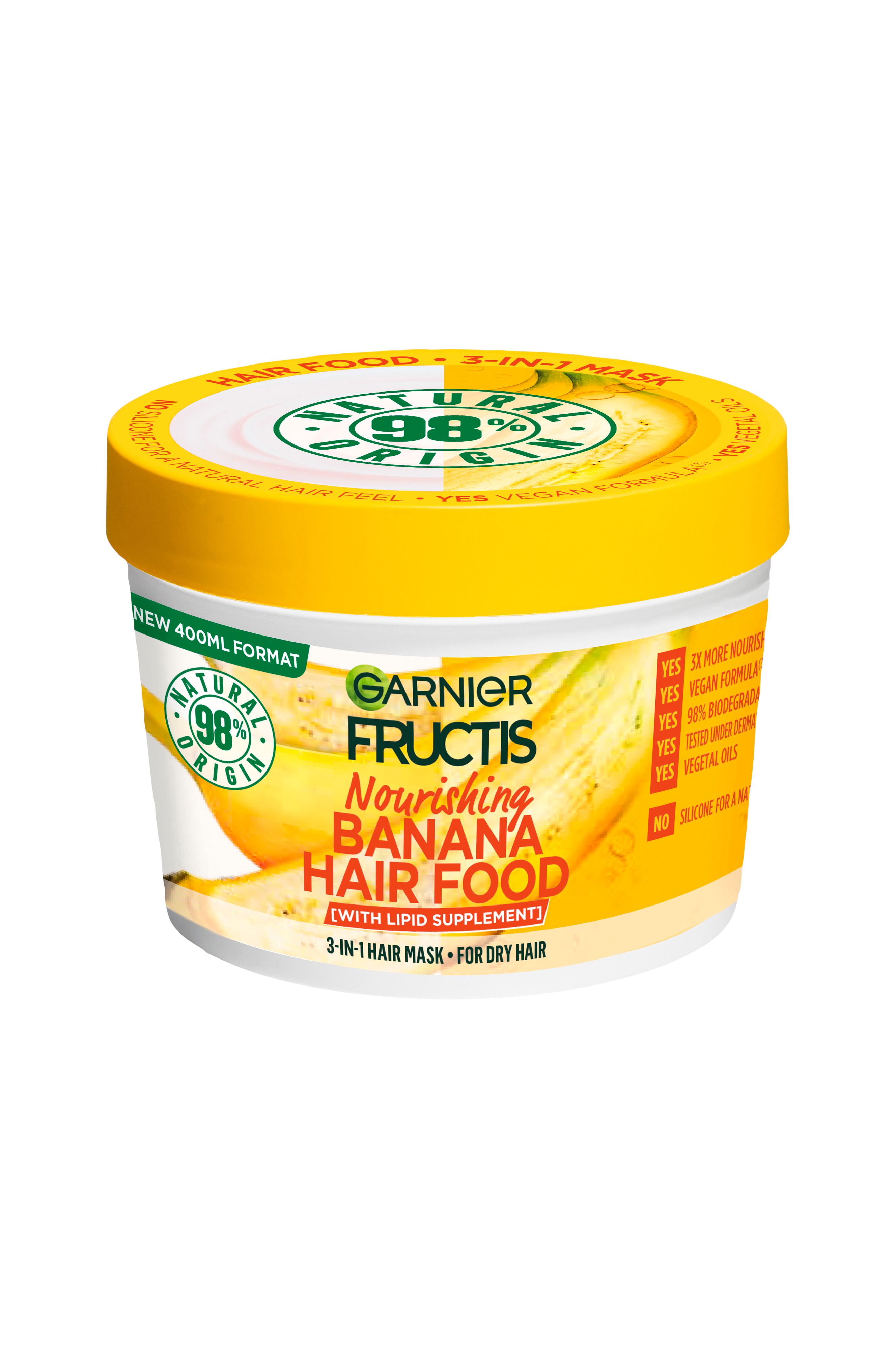 Garnier Fructis Hair Food Banana hårkur til tørt hår giver intensiv næring og gør håret glat og let at rede ud. Vegansk formel** med ingredienser af 98% naturlig oprindelse og 98% biologisk nedbrydelig***. Uden silikone for et naturligt udtryk. Bruges som balsam, hårkur eller leave-in.
