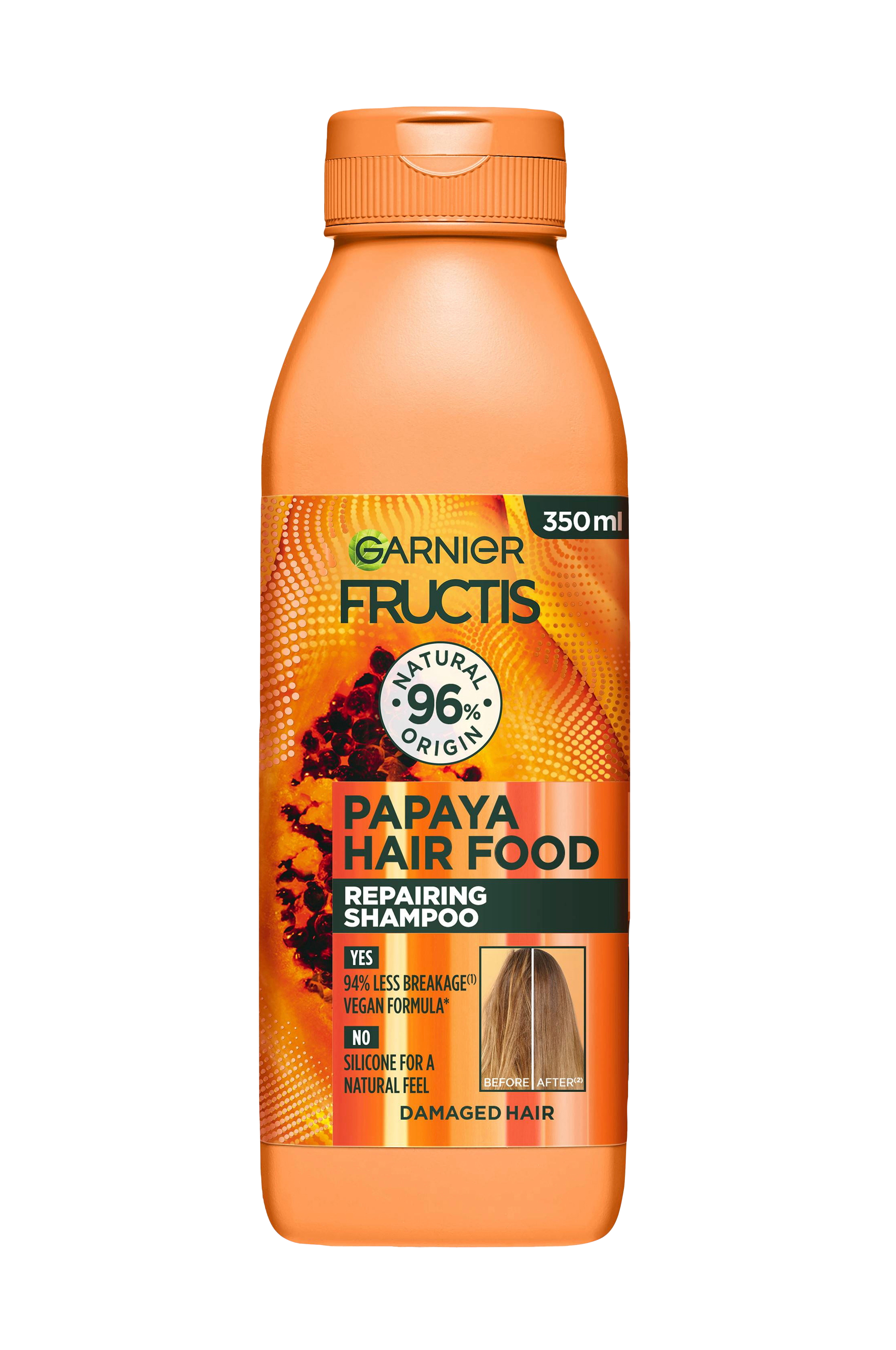 Garnier Fructis Hair Food Papaya Repairing Shampoo til skadet hår reparerer intenst hårfiberen for at modvirke at dit hår knækker* samtidig med at den renser håret og giver en sund glans. Den veganske** formel er uden silikone for en naturlig følelse og er beriget med plantebaserede olier samt plejende ingredienser af naturlig oprindelse.