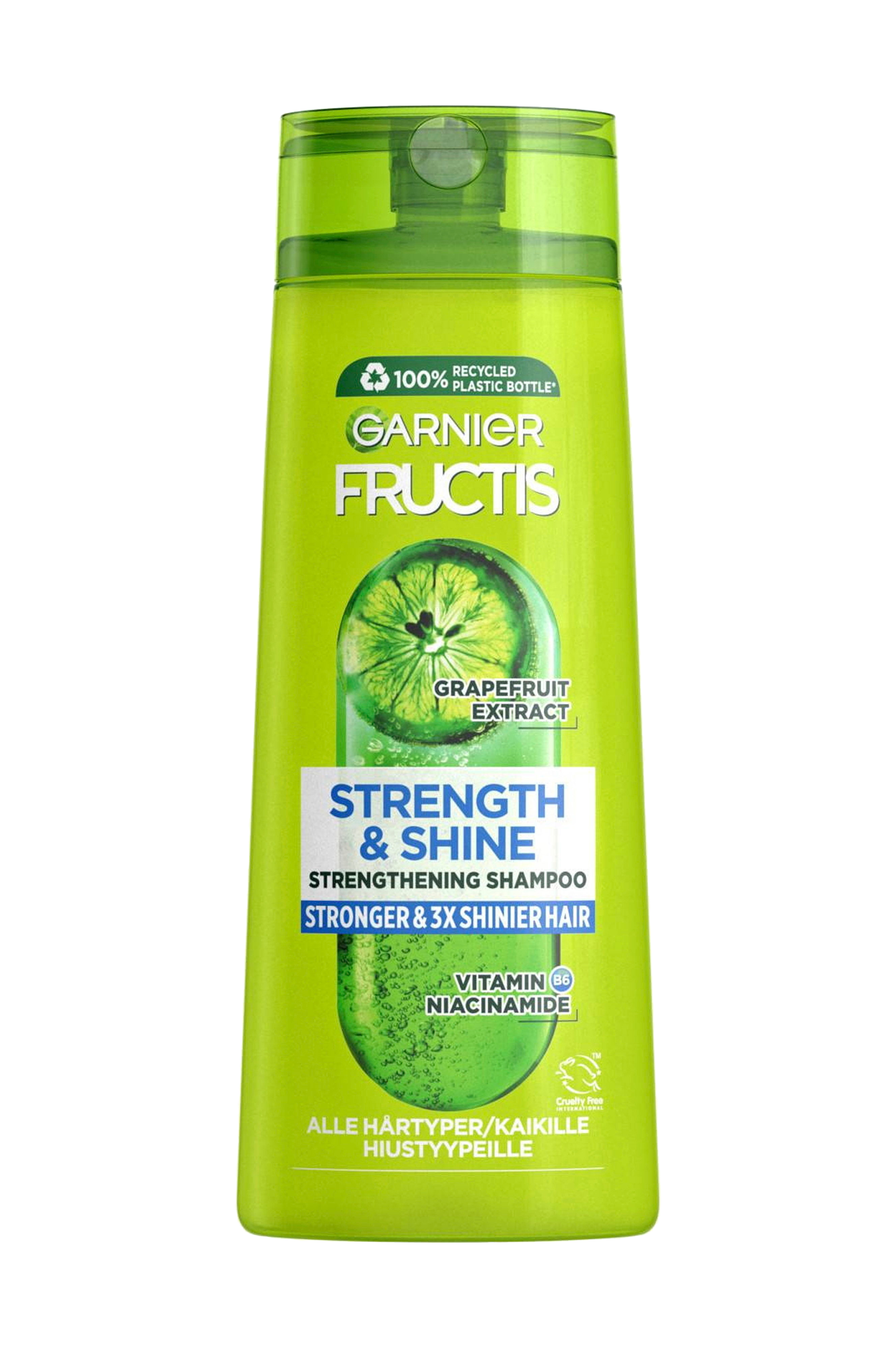 Garnier Fructis Strength & Shine shampoo hjælper til at styrke håret fra rod til spids og gøre det 3X mere glansfuldt*. Den veganske formel** passer til alle hårtyper og er beriget med grapeekstrakt, vitamin B6 og niacinamid.