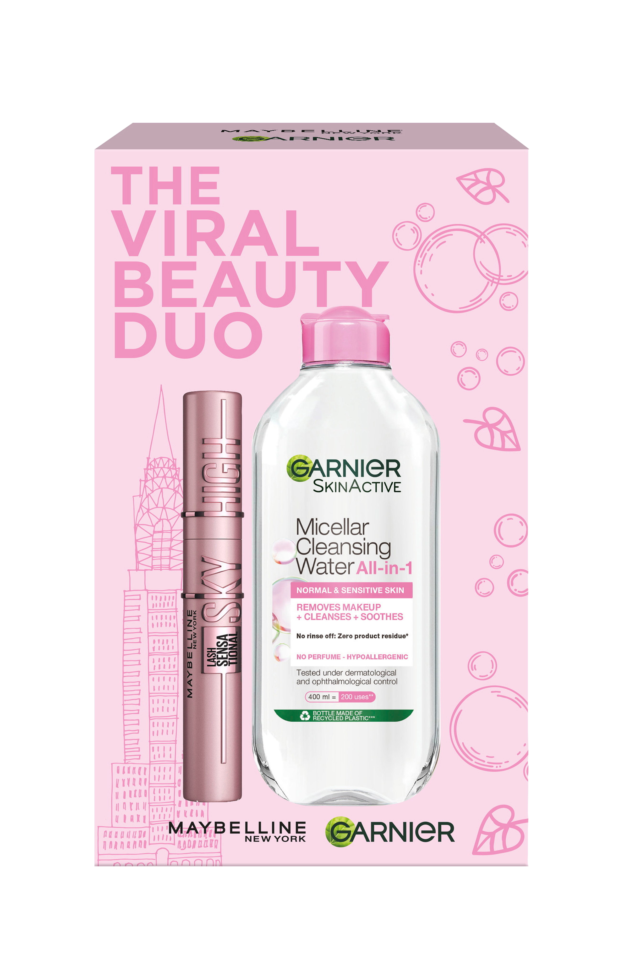 Garnier The Viral Beauty Duo Gift Box indeholder den populære Maybelline Lash Sensational Sky High Mascara Black + Garnier Micellar Cleansing Water for Sensitive Skin 400 ml. Mascaraens unikke formel løfter vipperne uendelig højt - når det er tid til at lande så brug micellærvandet til skånsomt at rense og fjerne makeup samt give huden en ren og frisk følelse.