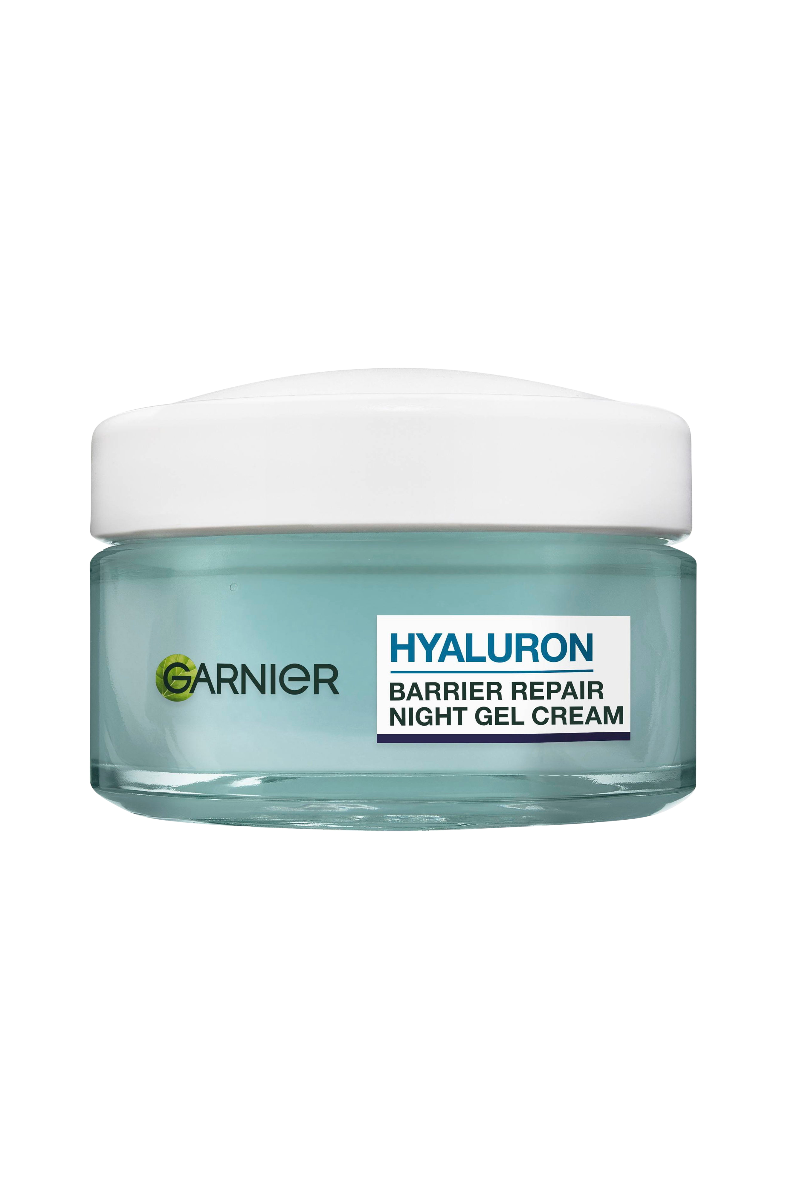 Garnier Hyaluron Barrier Repair Night Gel Cream er beriket med økologisk aloe vera og hyaluronsyre og gir huden intens fukt i 48 timer.