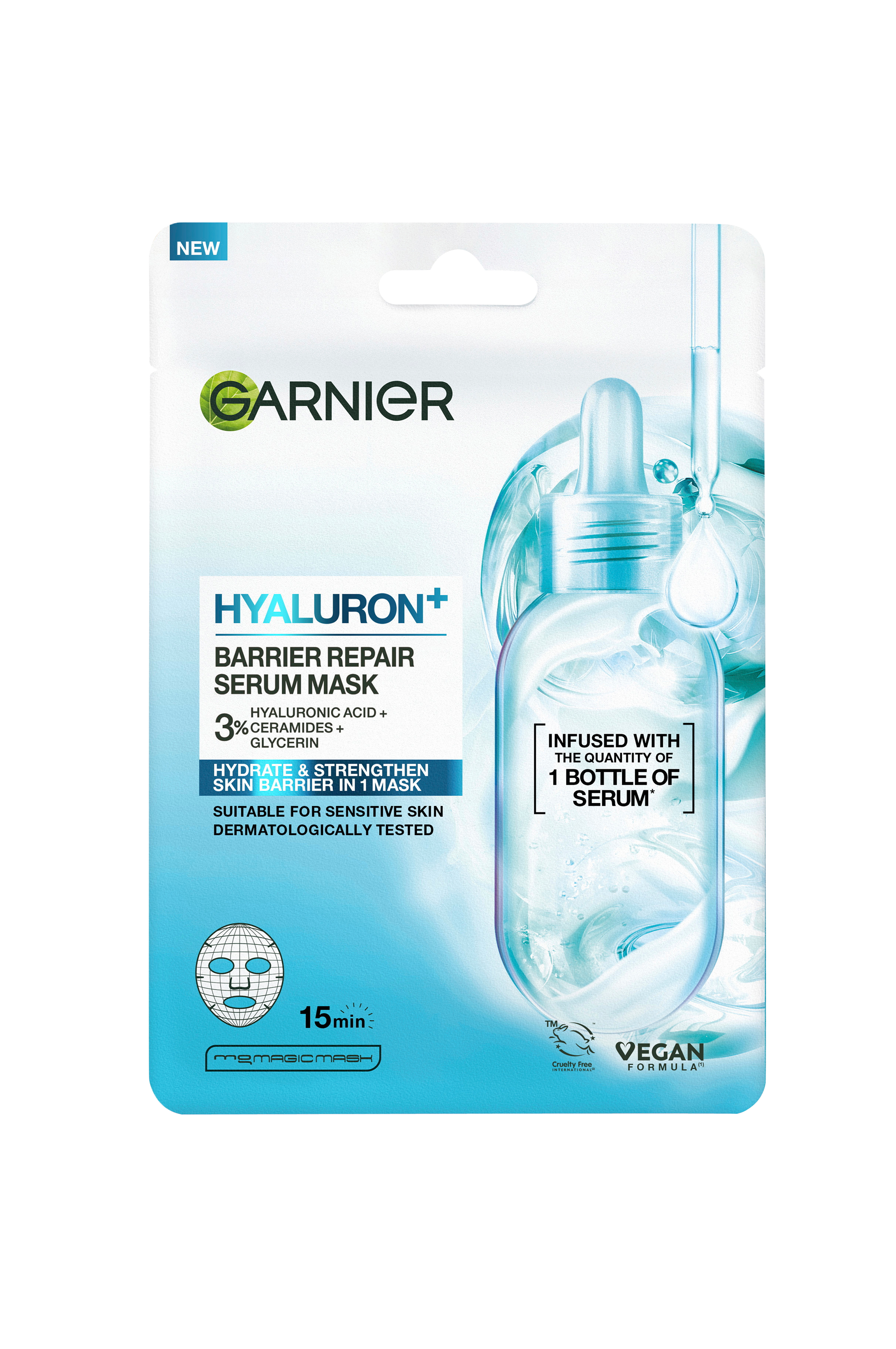 Garnier Hyaluron+ Barrier Repair Serum Sheet Mask er en sheetmaske til dig med sensitiv hud. Masken har en forme, der er beriget med hyaluronsyre og ceramider for at hjælpe med at fugte tør hud. Masken er beriget med en mængde der svarar til en flaske serum* og hjælper med at styrken hudens barriere**. Resultat? Huden føles mere fugtet, glattere og mere smidig allerede efter første brug***. Passer alle hudtyper, også tør hud.