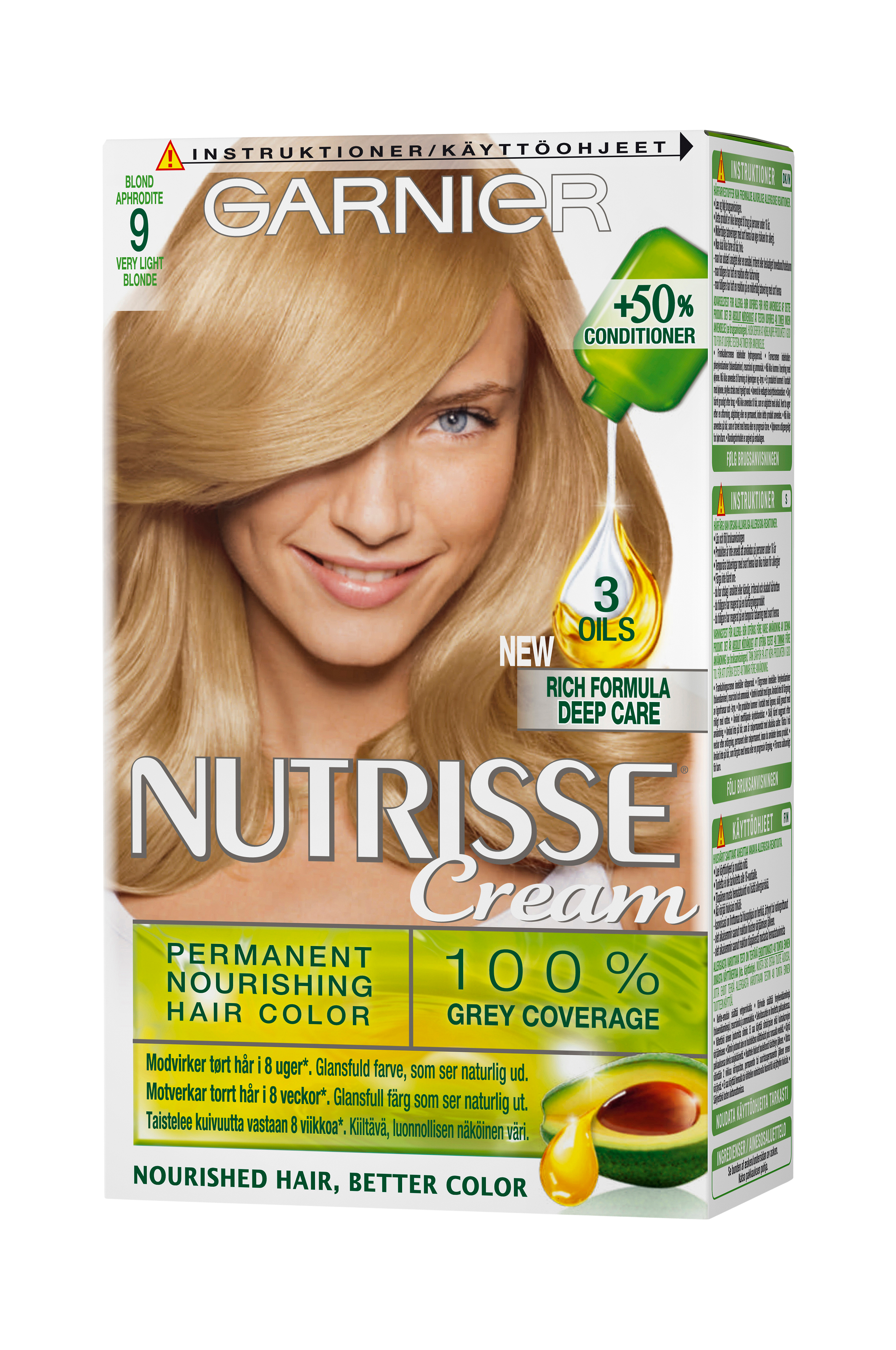 Nutrisse Cream 9 meget lysblond er en smuk, lysblond hårfarve, fuld af glans der passer til naturligt meget lyseblondt til blond hår. Resultatet afhænger af din naturlige hårfarve. Er du i tvivl om, hvilken af to nuancer du skal vælge, så vælg den lyseste. Dækker grå hårstrå 100%.