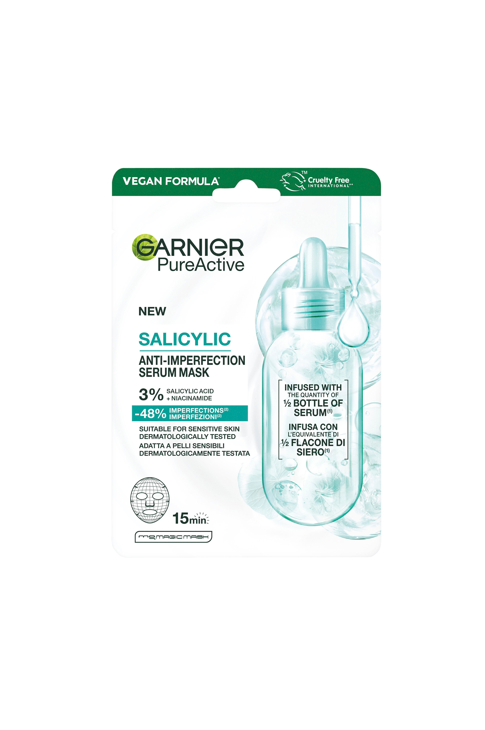 Garnier Pure Active Salicylic Anti-Imperfection Serum Mask er en ansigtsmaske som er udviklet til at hjælpe med at rense huden på kun 15 minutter. Formlen, som er beriget med mængden af en halv flaske serum*, indeholder salicylsyre og niacinamid og virker på urenheder, hudtekstur og porer.
