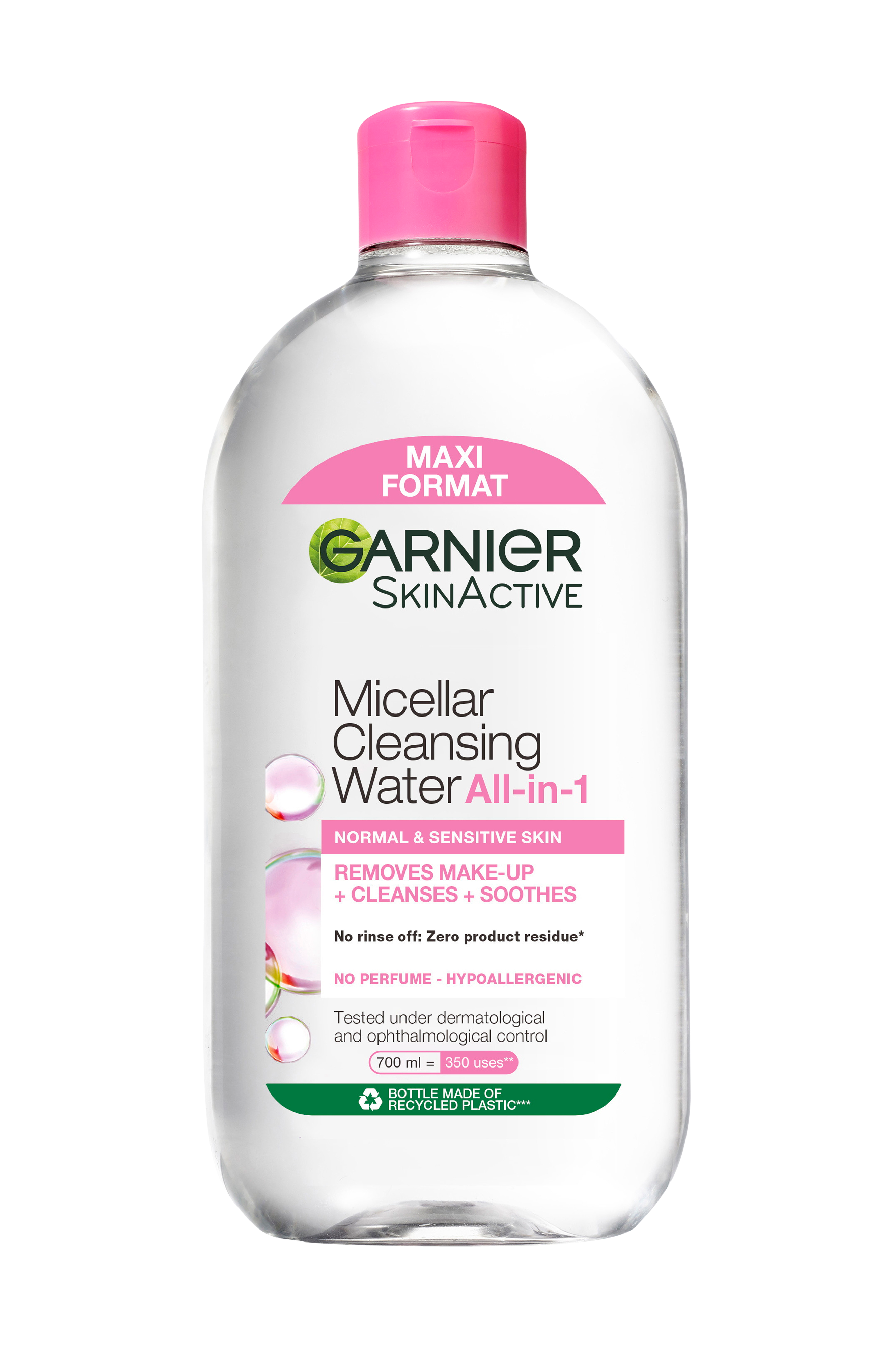Opdag et renseprodukt med miceller, som tiltrækker snavs som en magnet, Garnier Micellar Cleansing Water – rensevand til normal og sensitiv hud. Hvem passer den til? Denne rensevand passer til dig med normal og sensitiv hud, som ønsker et effektivt, hurtigt og let anvendeligt produkt, som renser huden og fjerner makeup på én gang. Hemmeligheden Garnier Micellar-rensevand med miceller, som tiltrækker snavs som en magnet, er en utrolig enkel og behagelig måde at fjerne makeup og rense huden på. Den plejende formel kan anvendes på alle områder af ansigtet (ansigt, øjne, læber), og du behøver ikke engang at skylle den af efterfølgende. Og resultatet? Resultatet er en behageligt rengjort hud. Anvendelse Påfør på ansigt, øjne og læber med vatrondeller. Skal ikke skylles af.