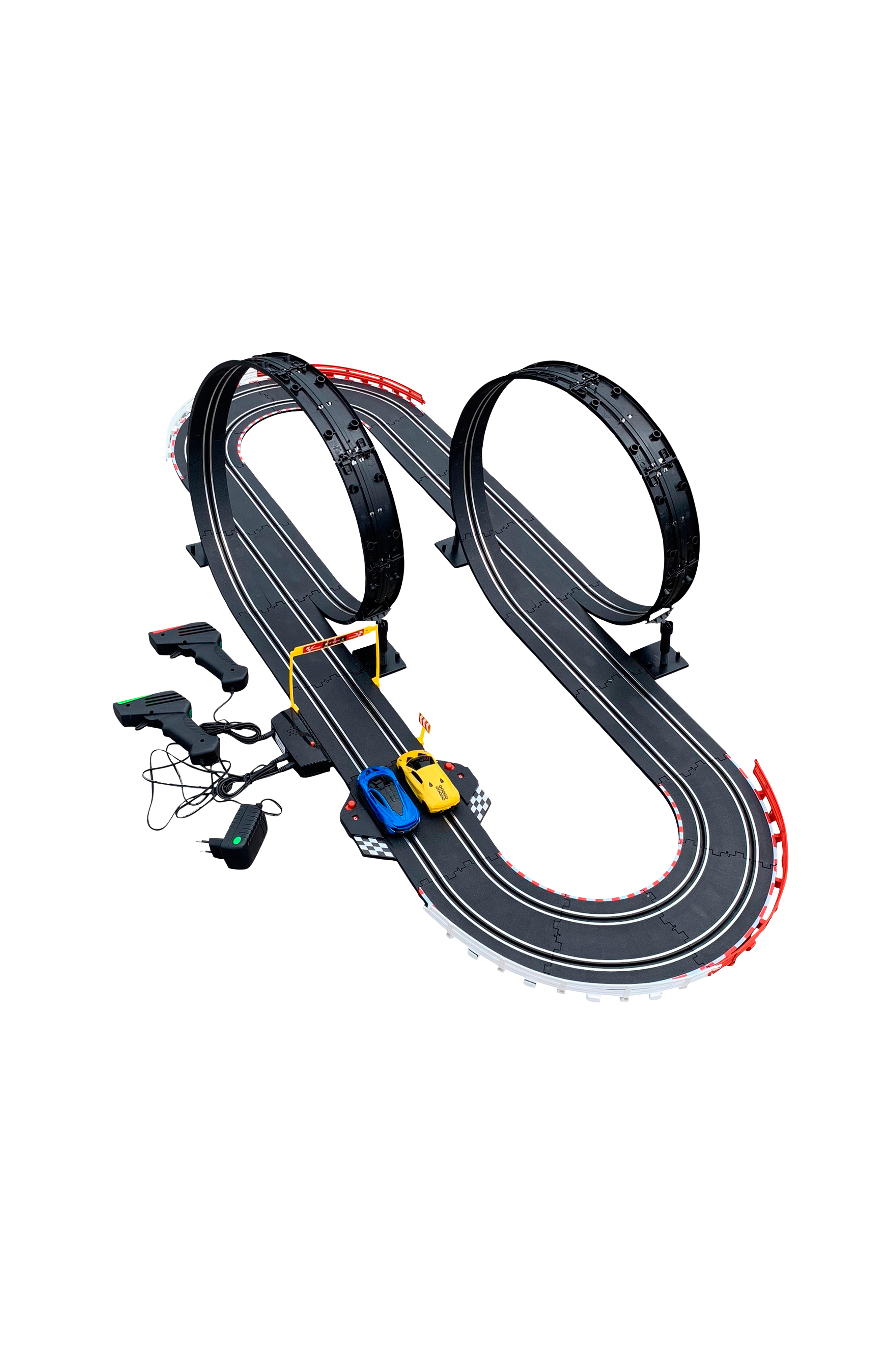 Sej bilbane!550 cm bane, 2 sportsvogne, 2 gashåndtag, looping, omgangstæller samt vægadapter.