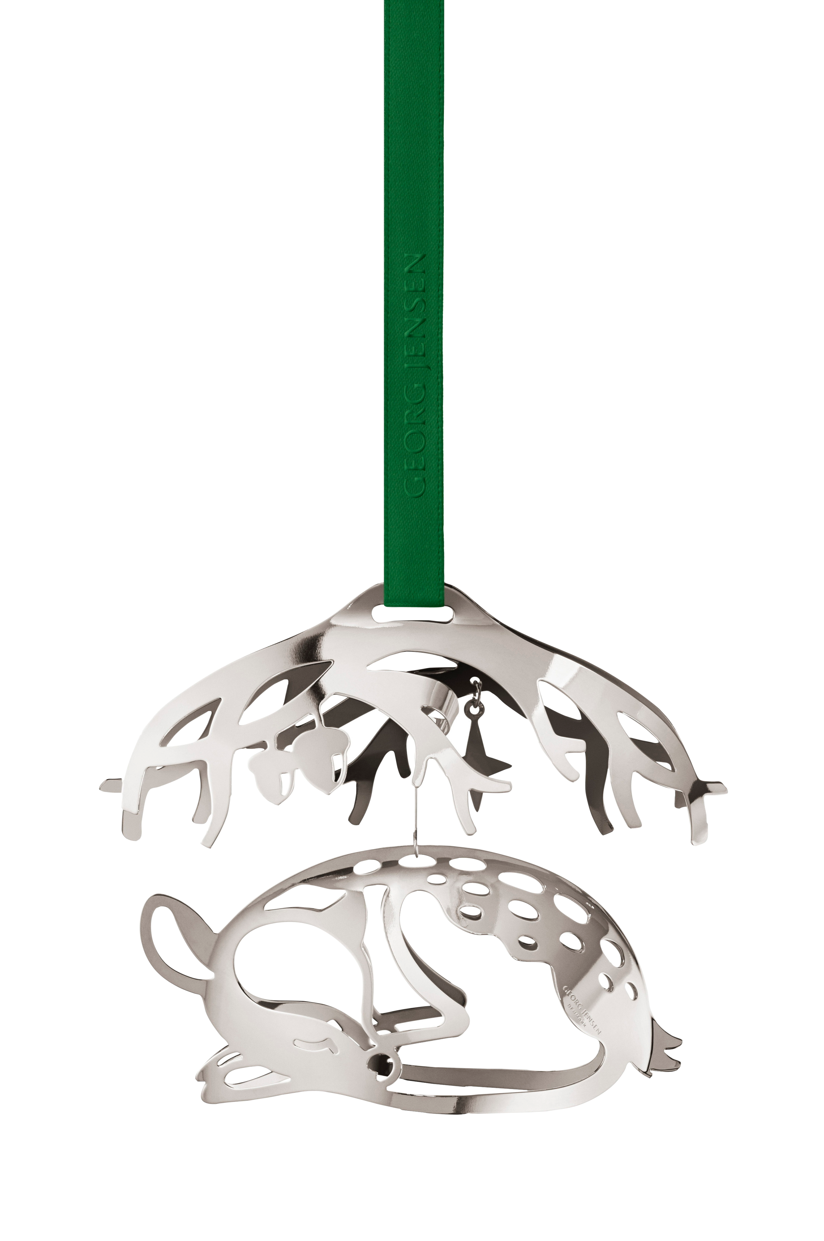 Et sovende dådyr under træernes grene er motivet på Georg Jensens juleuro 2023. Designeren Sanne Lund Traberg har genskabt vinterskovens miljø i 2023-julekollektionen og er blevet inspireret af magien i årstidens smukke landskab. Juleuroen er håndlavet i messing, belagt med palladium. To specielle bånd til ophæng medfølger, et rødt og et grønt.