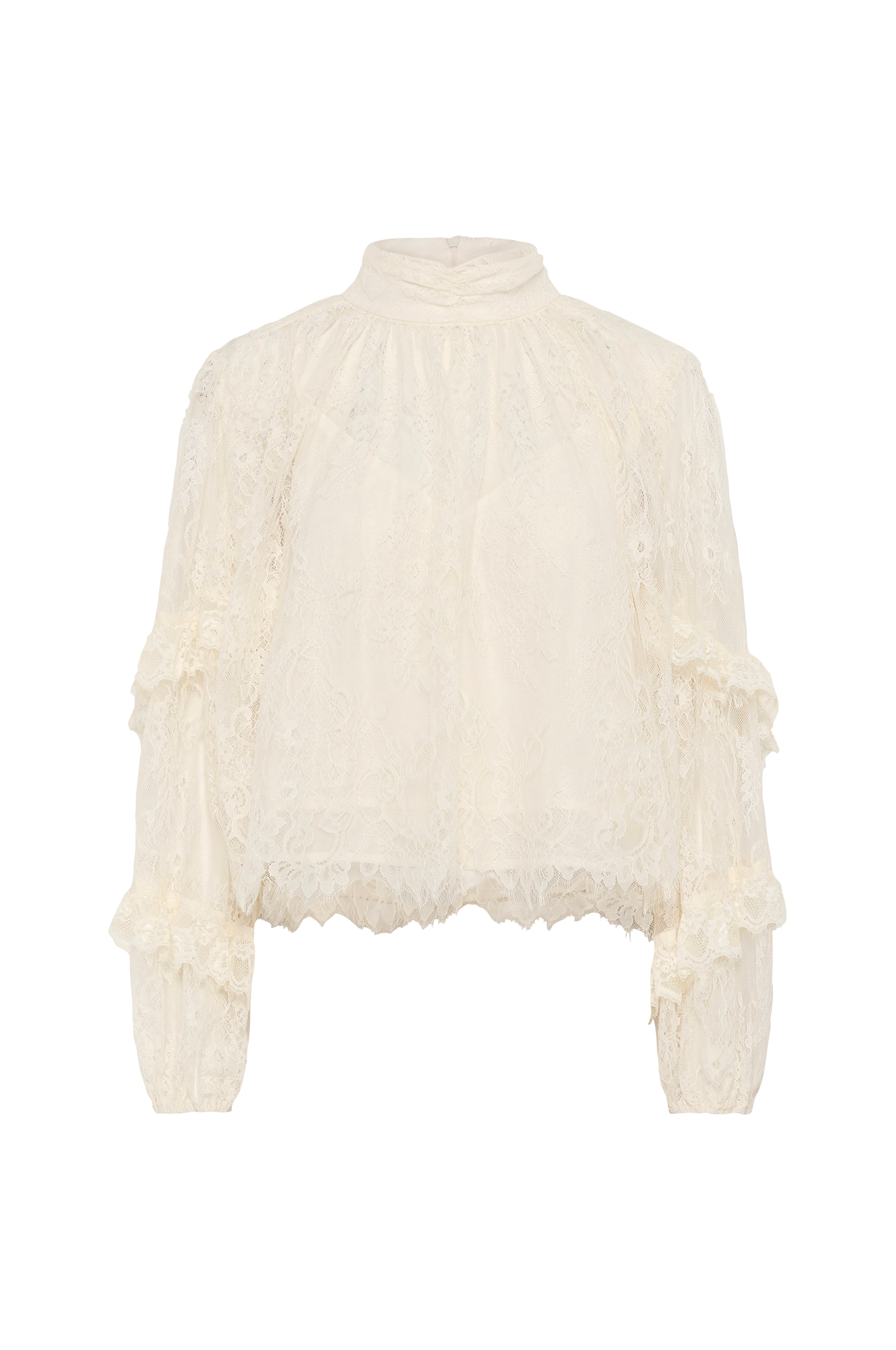 • Foret bluse i blonde• Høj halsudskæring med lynlås• Lange ærmer med volanter og elastik ved manchetterne• Frynset kant nederst