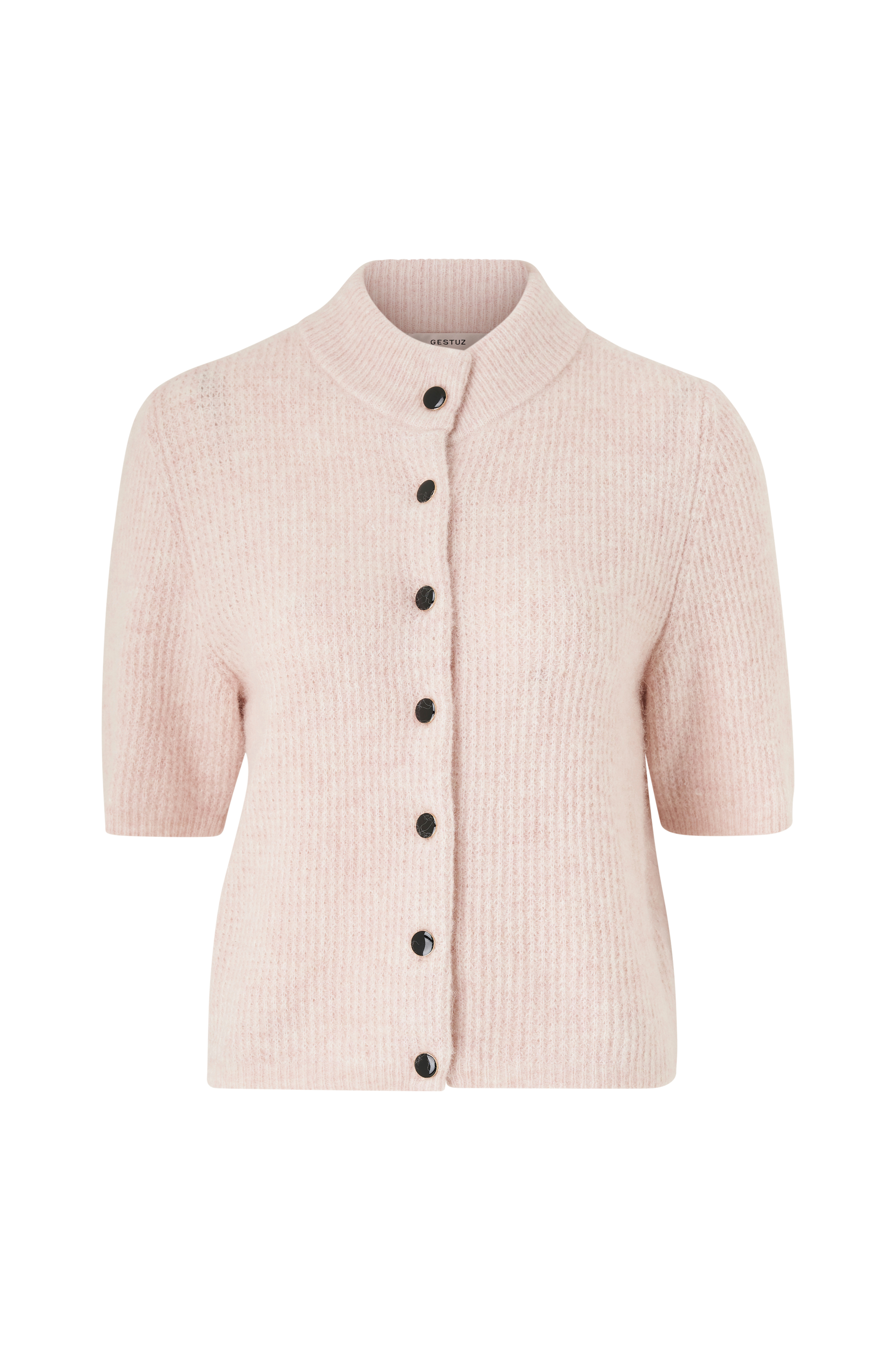 • Blød kvalitet med alpaka og uld• Firkantet pasform• Høj, rund, ribbet halsudskæring• Korte ærmer• Knaplukning